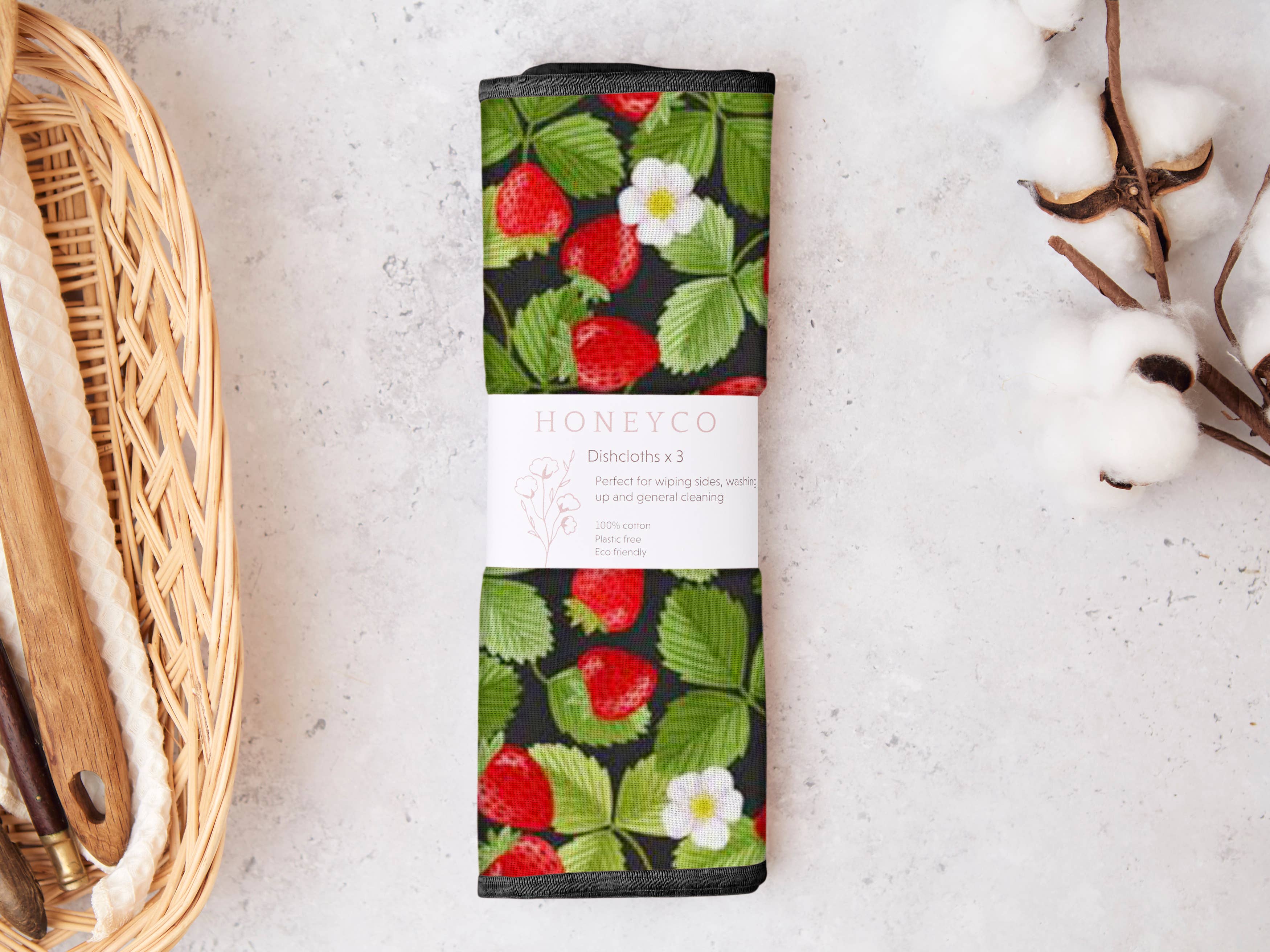 Our exceptional dish cloths provide the ultimate, environmentally friendly cleaning solution for your home! Whether you're washing dishes, wiping down surfaces, cleaning bathrooms, dusting, or even wiping mucky faces, our cloths are up to the challenge. This set is for a strawberry print, visit our shop for coordinating kitchen sponges or other patterns. Each pack contains three 100% cotton dish cloths approximately 25cm square. One side is printed so they look lovely on your sides, the other is waffle which is absorbent and soft, yet provides a gentle scrubbing effect for those tough stains. Simply rinse out any excess water after each use and allow the cloths to air dry. When it's time for a thorough clean, toss them in the washing machine with your regular laundry at a gentle 30 degrees celsius. Please note that there may be slight shrinkage after the first wash due to the fabric not being prewashed. This won't compromise the performance or quality of the cloths.
