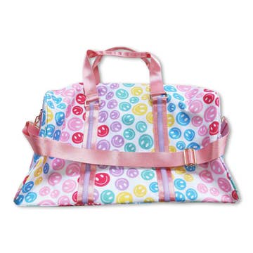 Introducing our Nylon duffel bags w/ assorted icon patches in a cute pattern!! Be sure to pack yours for sleepovers, dance class or your school uniforms! Such a cute way to carry whatever you need to take on the go! Makes such a great gift for that special fashionista! Comes with a shoulder strap as well. Available in 4 colors: Lavender, Blue, Hot Pink & Black Photo of Hot Pink & Black not shown. 17in x 7in x 10in