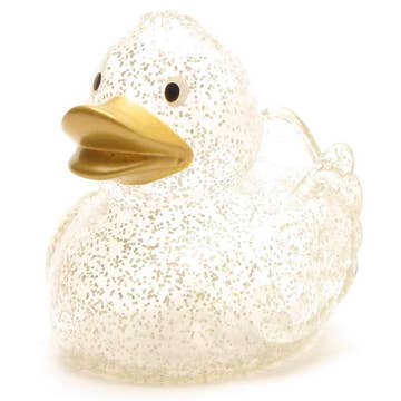 Glitter rubber duck with golden beak Dimensions: L: 7.5 cm W: 6.5 cm H: 7 cm Squeak hole: Yes Floats upright: No Material: vinyl Recommended age: For children aged 18 months and over
