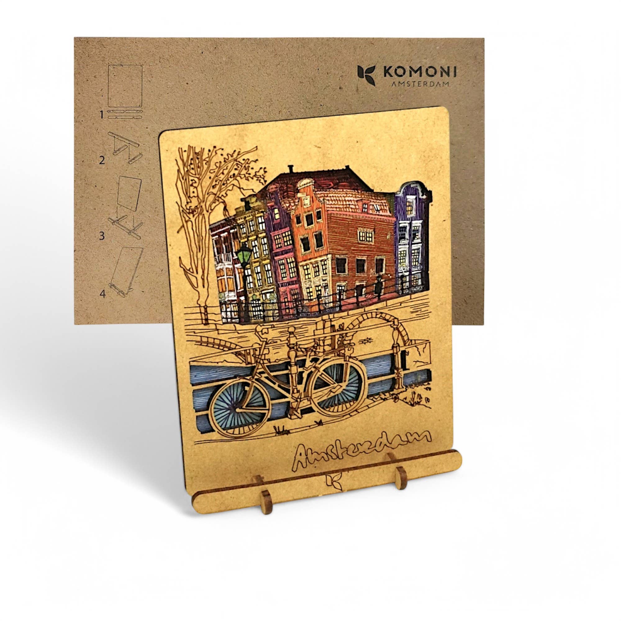 Product characteristics: * 100% recycled paper; * Strong wooden cover made of residual wood (MDF); * Approximately 100 pages; * Blank, lined or dotted paper; * A6 size (13x14,5cm), A5 size (16x22cm) or A4 size (24x28,5cm); * Refillable; A beautiful designed notebook Also useable as a diary, sketchbook or bulletjournal. This design was made by ©ELLES, an Amsterdam based artist which we truly admire! Unique gift For a loved one, friend, colleague or yourself ofcourse! With this notebook you have something original, unique and sustainable. Sustainable materials Our notebooks are made with FSC certified 100% recycled paper and FSC certified wood (MDF). KOMONI Amsterdam In our everyday decisions, we always take the planet and sustainability into account. It is our first priority to leave a minimal carbon footprint.