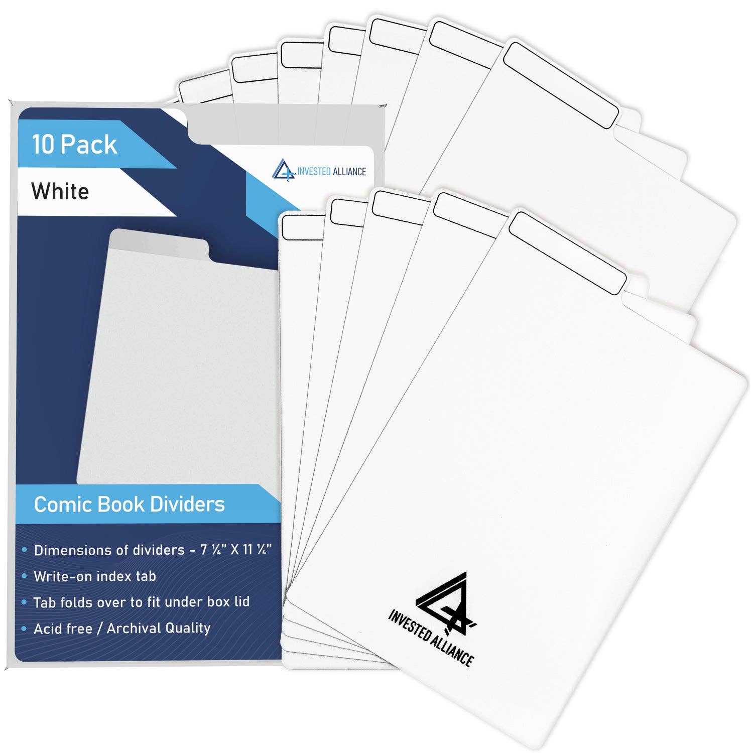 * 200 white dividers per pack. * The dimensions of the dividers are 7 1/4" x 11 1/4". * Key features include: acid free, archival quality, write-on index tab. * The write-on tabs fold underneath the box lid and allow collectors to easily organize their collection. * Invested Alliance Comic Book Dividers are made from a high-density polyethylene plastic and a 30PT thickness that will fit perfectly with our Comic Book Storage Boxes.