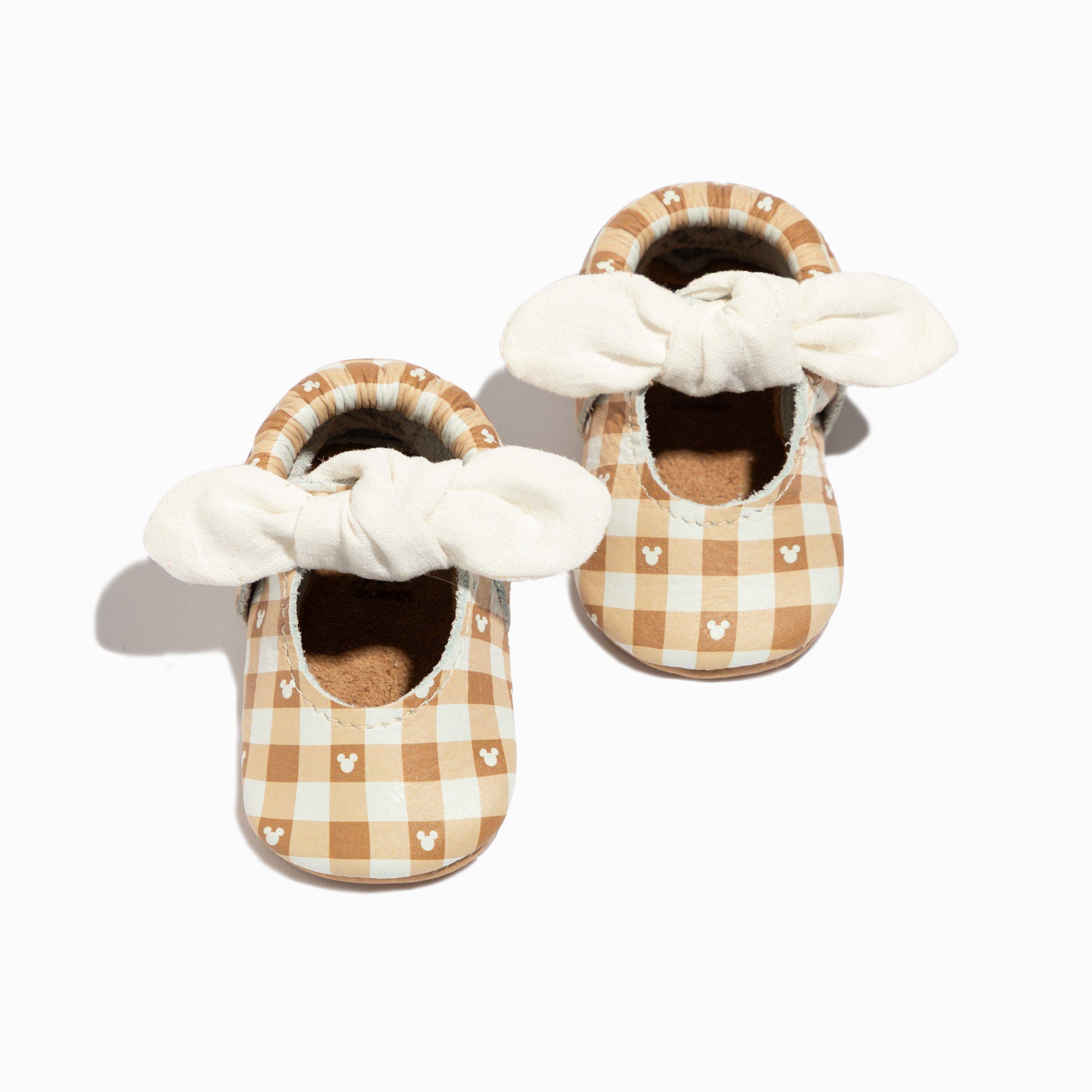 These shoes are great for little feet on the move! They are made of soft cotton lycra fabrics. Elastic on the heel keeps them from slipping off. The inners are lined with a layer of soft cotton velour for added softness and a little cushion. The insides of the shoes feature a seamless design so there are no exposed seams to irritate little feet. They are machine washable, but dry on low or air dry with a fluff after drying. These cotton lycra shoes are great for little ones with chubby feet. The extra stretch of the material allows for a more comfortable fit. For the lining material, you can now choose Cotton Lycra or Cotton Velour! Cotton Lycra is perfect for little feet who get very warm, great for summer. Cotton Velour is soft and fluffy and will keep little feet warm in the winter. Do you have a crawler or a little one who is tough on the toes of soft sole shoes? Then DuraToes are your answer! DuraToes are a sewn in toe cap of the Tough Tek sole material that protects the tip of the shoes. To ensure a great fit for shoes and wiggle room in the toes for crawlers and walkers, measure your child's foot and add 1/2 inch to 3/4 inch for smaller sizes and 3/4 inch to 1 inch for larger. Sole Materials: Faux Suede - A camel colored suede that is soft and flexible. Can be used for size NB, 0-3m or 3-6m. Black Gripper Dot - Black dots on black fabric. Gripper dot soles are not waterproof. The dotted soles provide a little more traction and are perfect for walkers-in-training! Can be used for 0-3m, 3-6m or 6-12m. Black Tough Tek - a waterproof non-slip material is great on all surfaces. These soles are perfect for walkers-in-training and the expert walkers alike! Will be used on size 12-18m and up. *This is a stock photo. Actual pattern placement will vary between pairs of shoes.* Please send me any questions you may have!