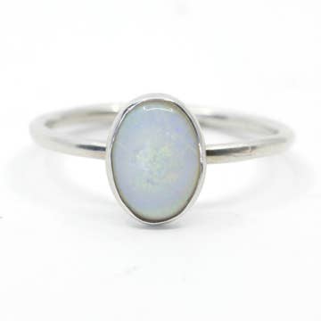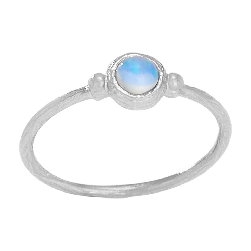 Sterling silver 2mm bead band with 5mm round synthetic opal. Available in whole sizes 6-9.