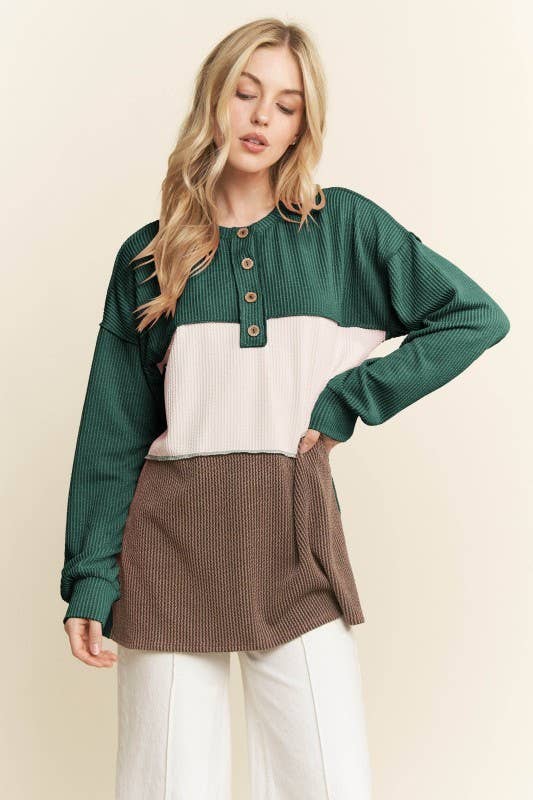T1578-2D Color-block Ribbed Oversized Button Up Tunic top