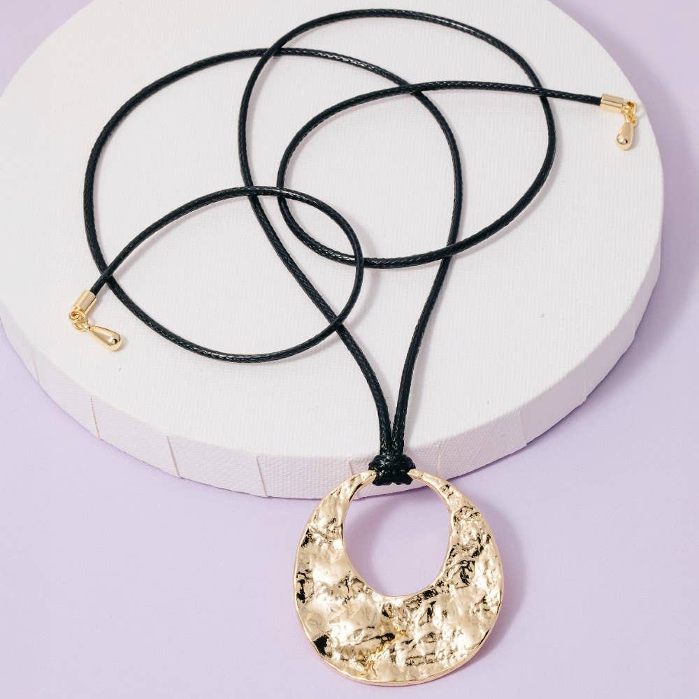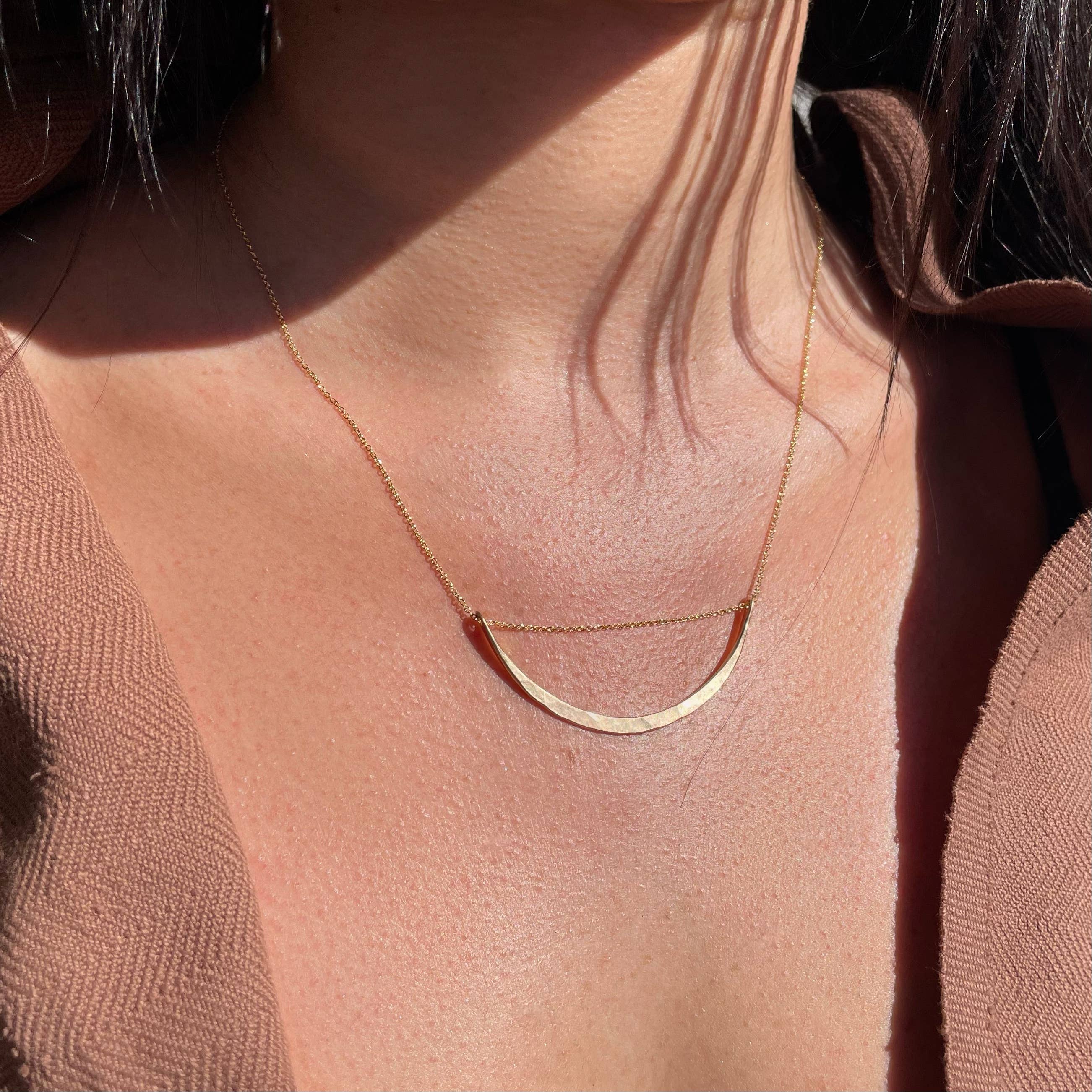 Hand-hammered large bronze half circle focal on 17" raw brass cable chain. Please note that all items are handmade and slight variations may occur. Follow us on Instagram: @hippokisscreations