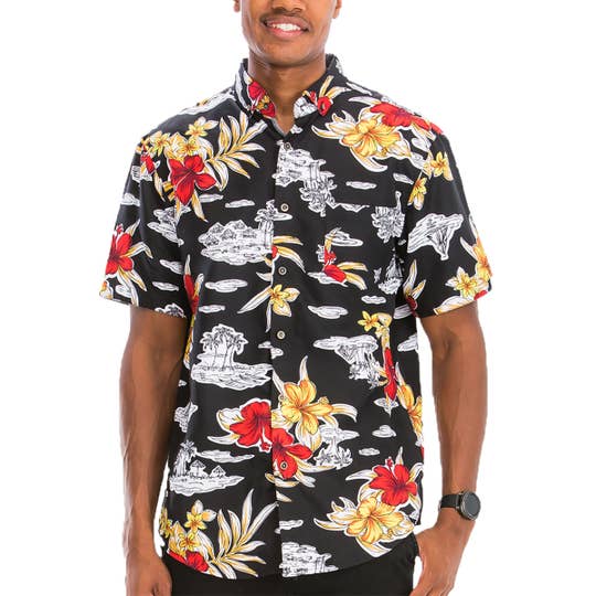SKU: PC-MEN-BTN-TIKI-S Made in China Aesthetic: Retro / vintage Care Instructions: Machine wash Color: Red Fabric: 93% Polyester, 7% Spandex Fit: Unisex Neckline: Collared Occasion: Everyday and Resort / Vacation Pattern: Tropical Season: Resort Sleeve Length: Short Sleeve Product Language: English Weight: 170.1 g (6 oz)