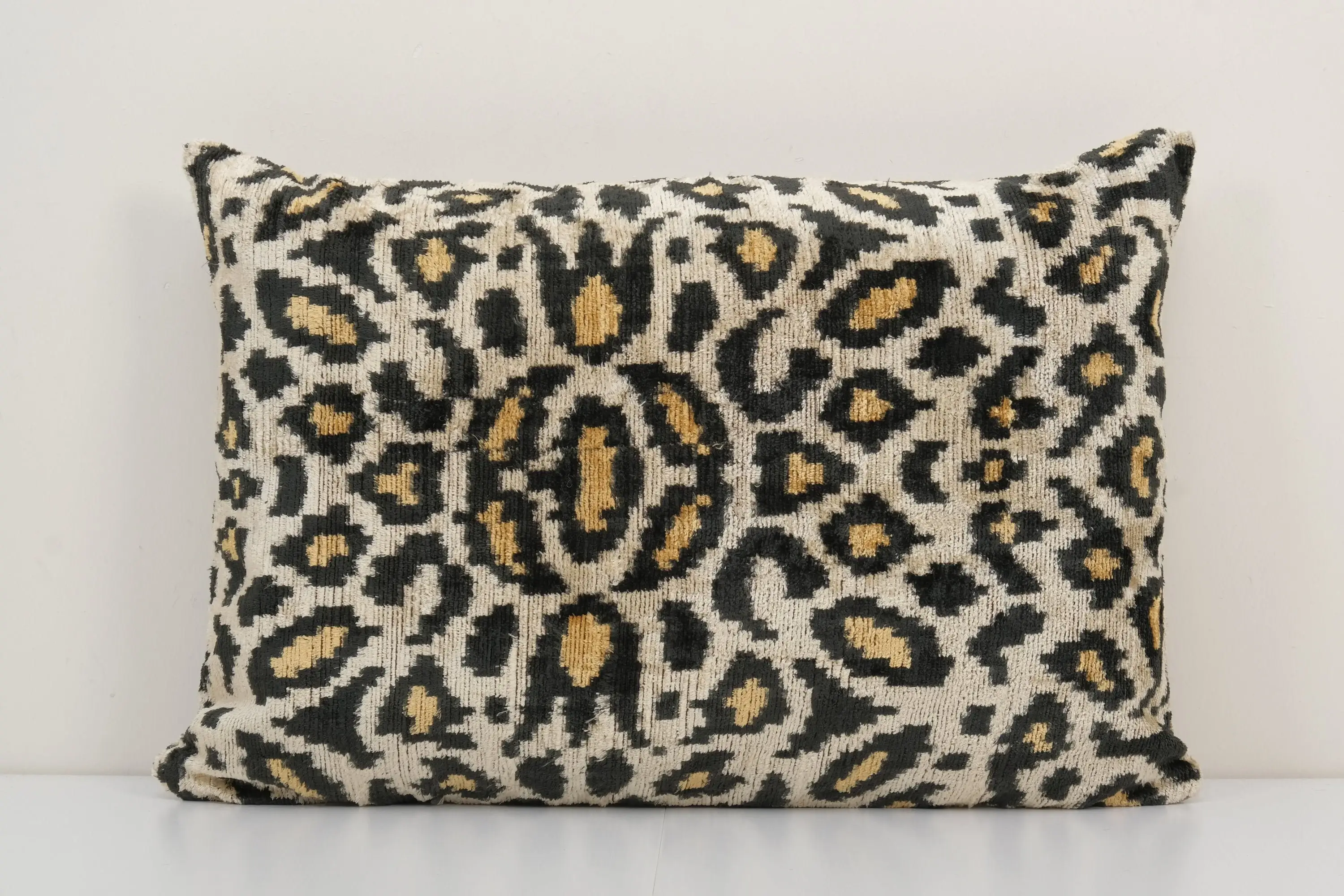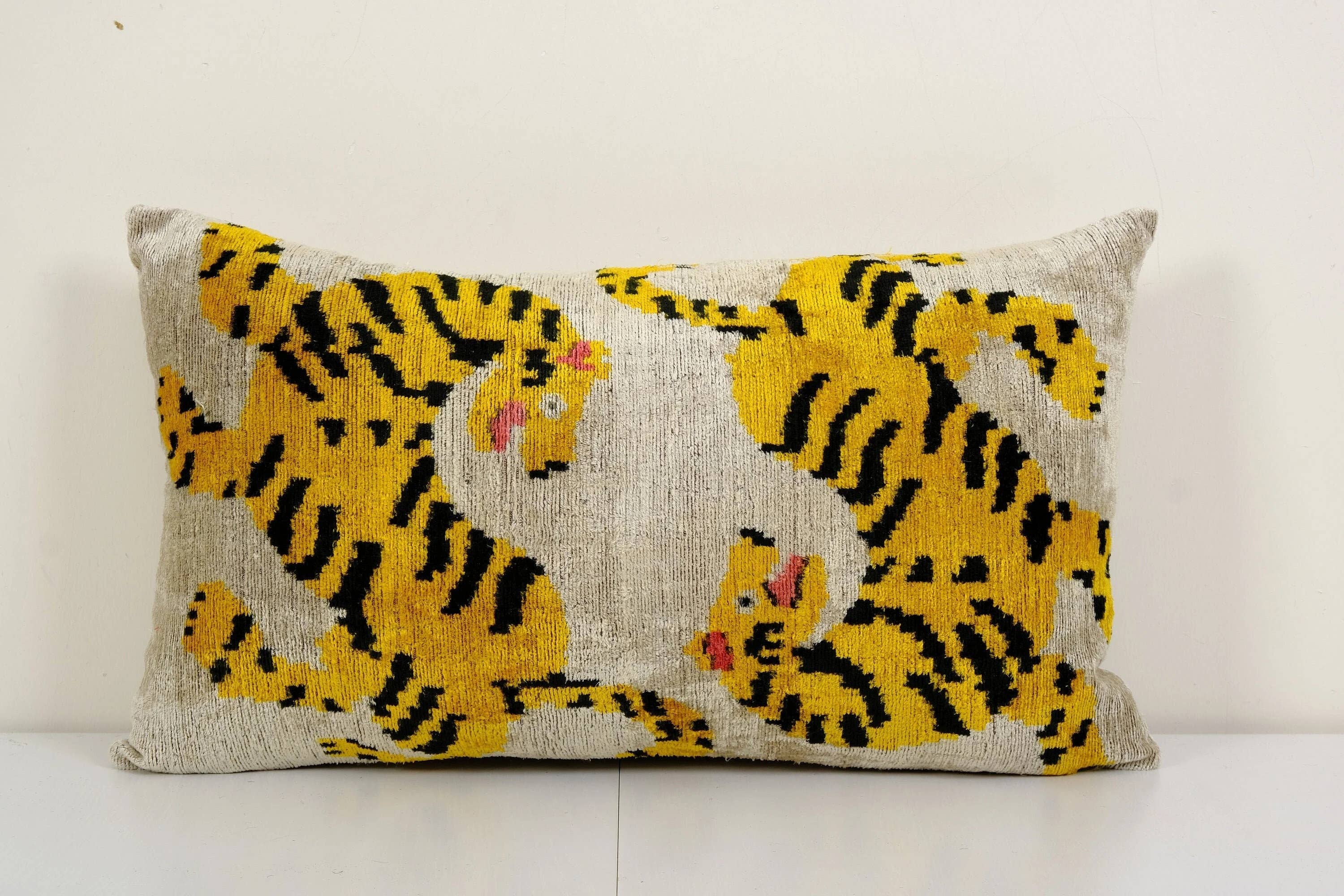 "Decorative Throw Velvet Ikat Pillow -Luxurious cushion cover of handloomed ikat fabric -Insert is NOT included -Color: Green and Beige -Ikat is an beautiful fabric, every pillow is unique but can also contain small imperfections; the charm of a handmade product. Dimensions: 16ʺW(40 Cm) × 6.0ʺD(15 Cm) × 49ʺH( 125 Cm) approx Warning: Since ikat is a handmade fabric, the width and length of the throw pillow can be a few inches smaller or larger. -Handloom 80% silk velvet 20% cotton -Back side is cotton fabric and with hidden zipper. -Handwoven velvet pillow case only, -Hand wash 30 C or dry clean -Colors may be slightly different in reality from those shown on the photos, due to the nature of photographing and device monitor settings. -Custom duties may apply."