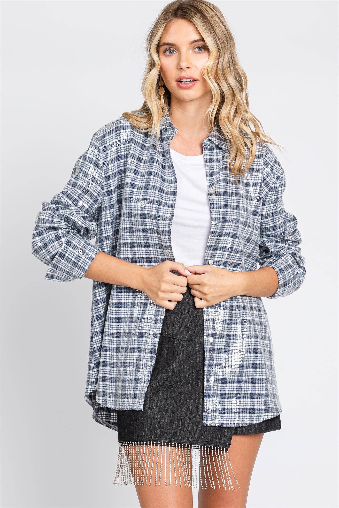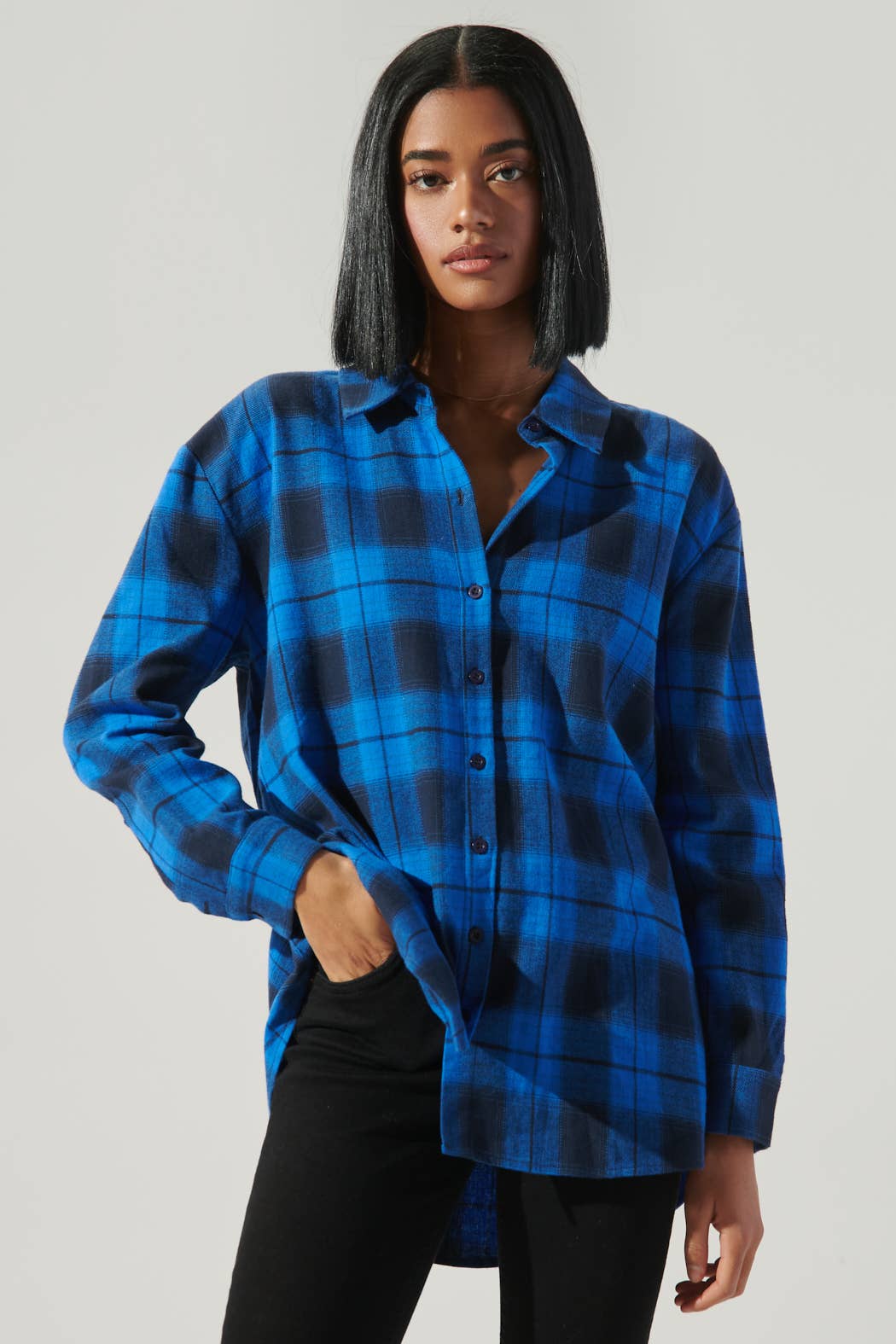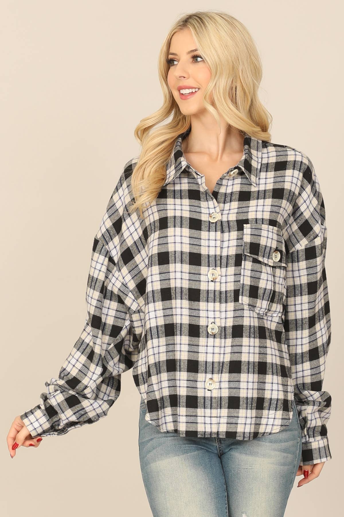 PLAID SLEEVE SHIRT - Unique design featuring solid-colored body and contrasting plaid sleeves - Soft, comfortable fabric – ideal for layering or wearing on its own - Front chest pocket for a casual touch - Classic button-down shirt with a relaxed fit STYLE MEASUREMENTS (SIZE SMALL) - TOTAL LENGTH 28 1/2" - BUST 19 3/4" - SLEEVE LENGTH 24" - SHOULDER 15 1/2" 60%POLYESTER, 35%RAYON, 5%SPANDEX | CONT:65%COTTON, 35%POLYETSER MODEL IS 5'10" | BUST 34" | WAIST 24" | HIPS 35" WEARING SIZE S