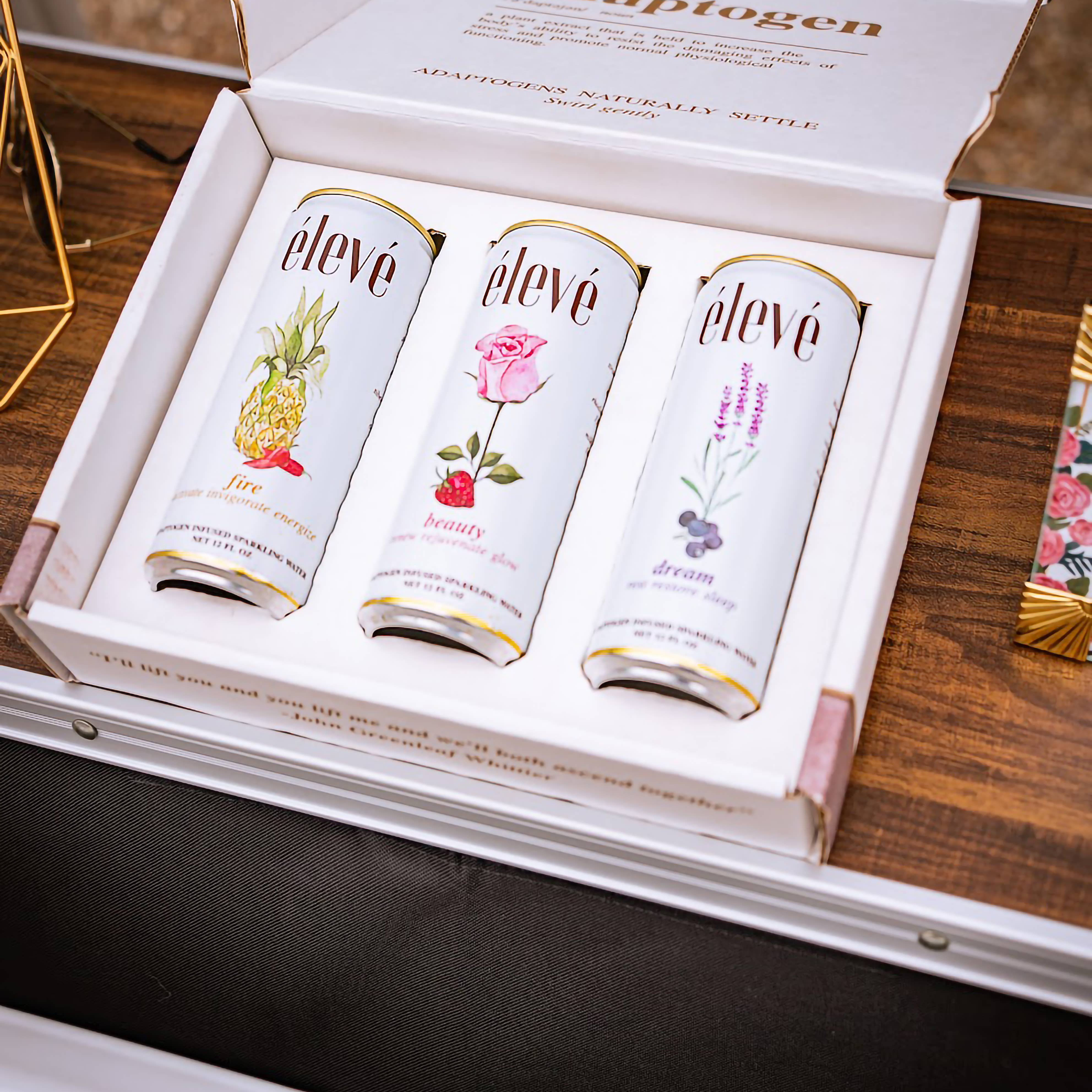 This product is an EMPTY box to fit 3 cans of élevé (we ask that you display Fire, Beauty, Dream in that order). Showcase all 3 flavors presented in a beautiful sampler box to increase sales. Purchase more to sell as a variety bundle (MSRP $16) or thank you gift for clients! *élevé cans sold separately Note: Suggested MSRP of $16 is for a complete box when 3 cans are packaged