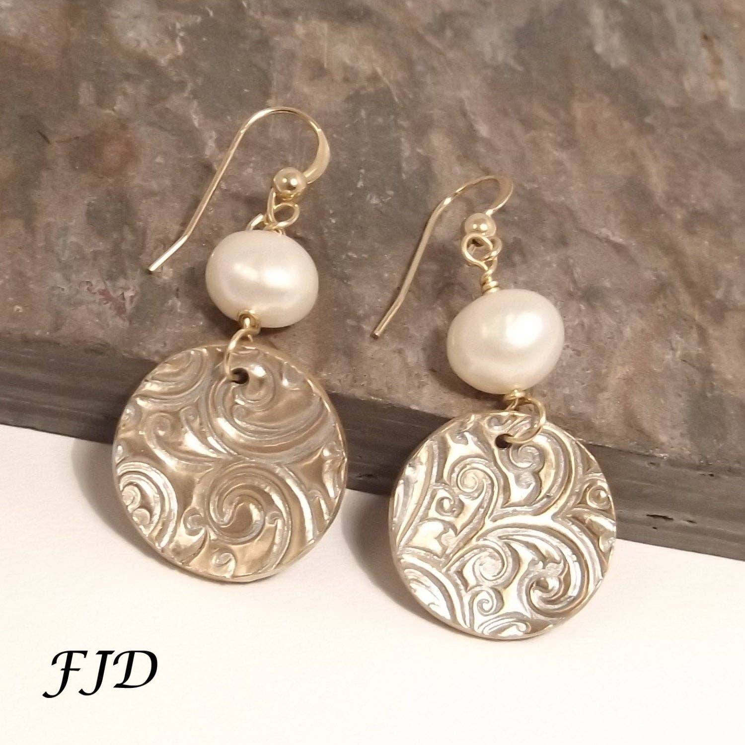 These dainty, mixed metal earrings are comfortable, elegant and perfect for everyday! Each earring is composed of 1 - 9mm creamy Freshwater Pearl, Sterling Silver Daisy Spacers, 14KT. Gold Fill saucer beads and a petite 3mm Freshwater Pearl. The dangles are suspended from 14KT. Gold Fill Shepherd Hooks. These earrings are 1-1/4" from the top of the ear wire to the bottom tip of the dangle.