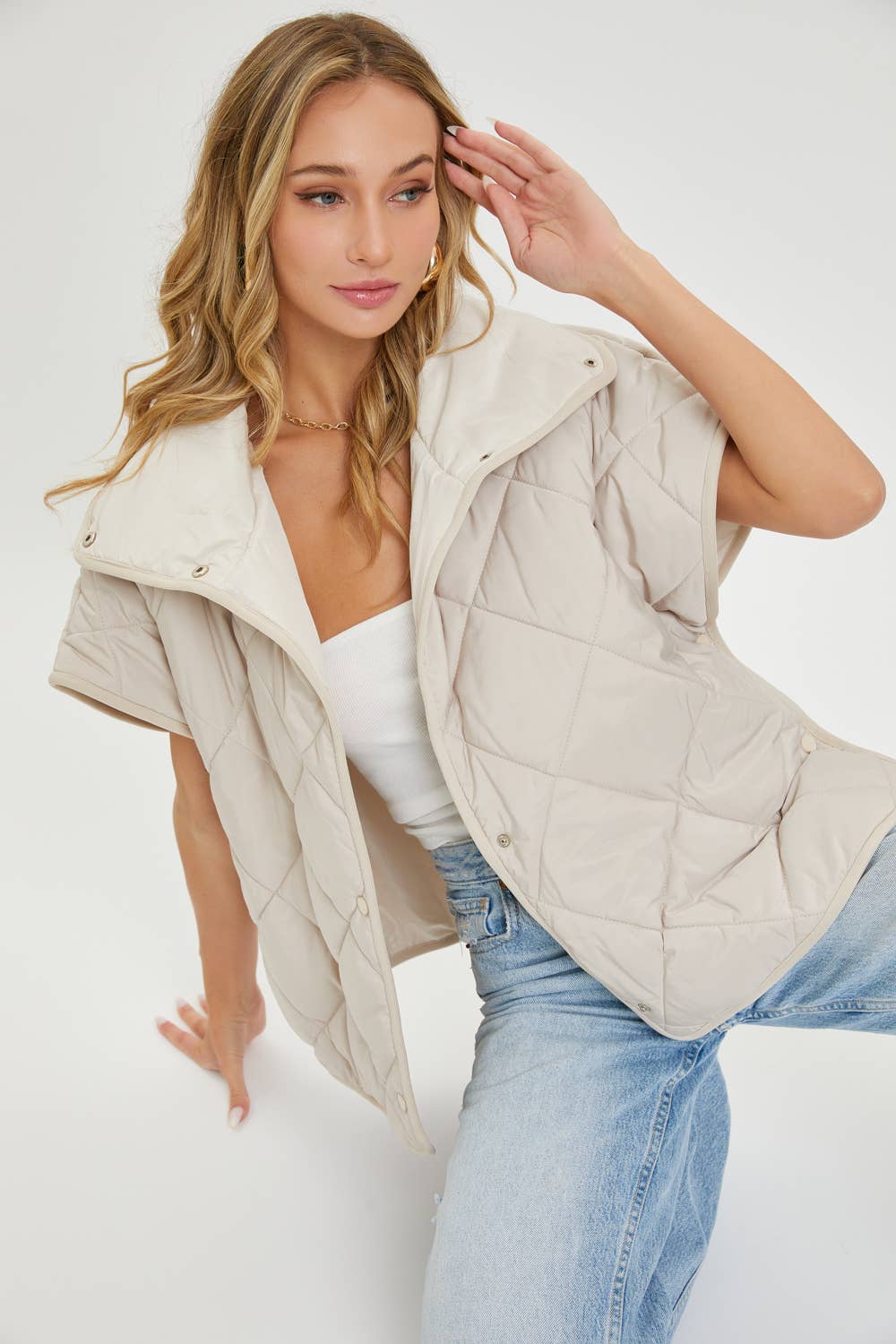 LIGHTWEIGHT QUILTED VEST FEATURED IN A DOWN-FILLED DESIGN ROOM FOR ALL TYPES OF LAYERS UNDERNEATH. PERFECT LIGHTWEIGHT FOR COOL DAILY COMMUTE. RELAXED SLIGHTLY OVERSIZED FIT WITH LONG ARMHOLES. CHILLY HIKES, AND WEEKEND CAMPING TRIPS. *DETAIL* -RELAXED, SLIGHTLY OVERSIZED FIT -LIGHTWEIGHT QUILTED FABRICATION -CASUAL EVERYDAY FOR COMFY -PERFECT THROW-ON-AND-GO PIECE TO PAIR WITH ANY CASUAL LOOK -SNAP-BUTTON CLOSURES -POCKETS -IMPORT