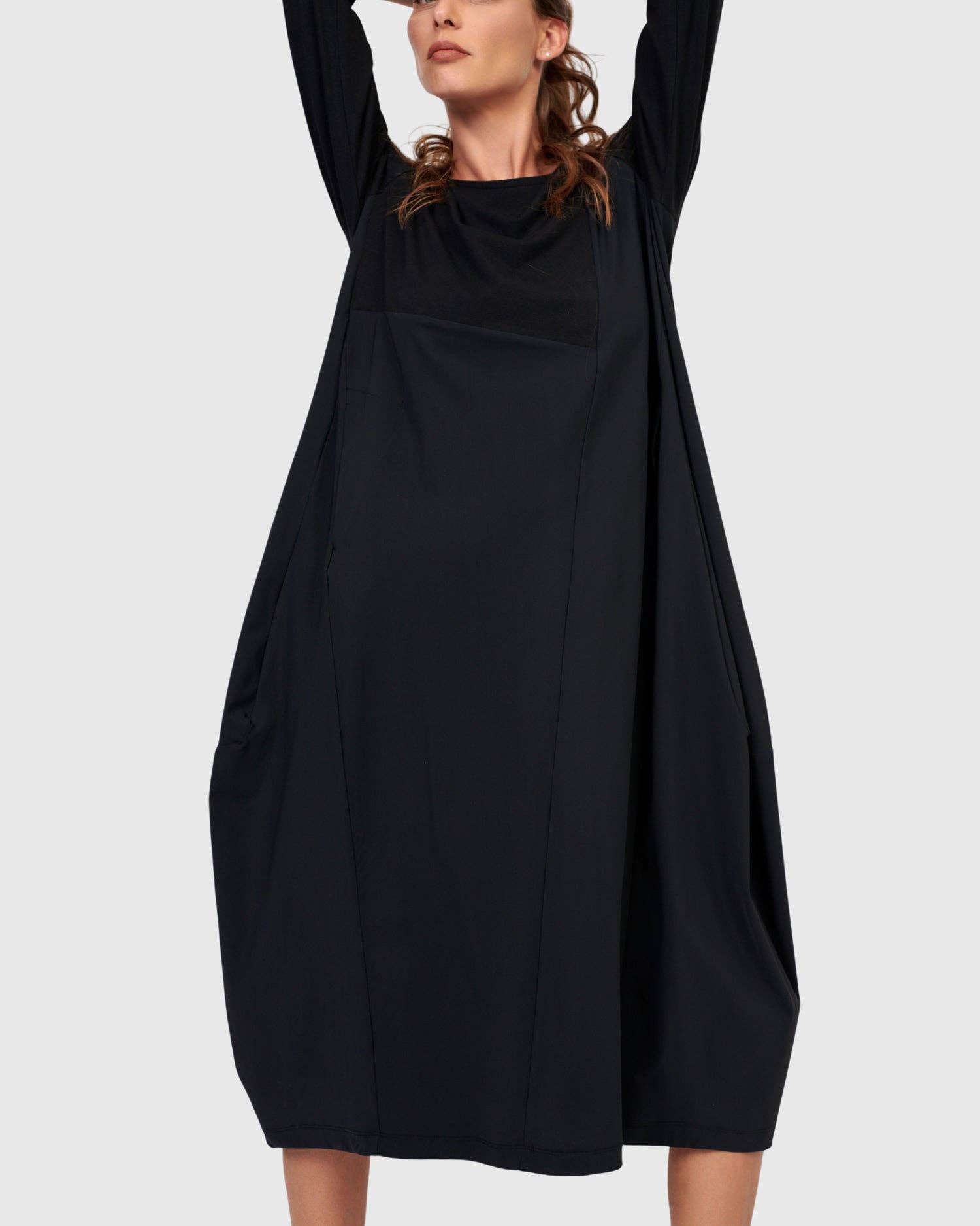 Fit & Sizing * Oversized fit, loose from bust to hem * True to size * Yanka is 5'9" & wears Alembika 0/XS (US 4-6) Materials & Care * Lightweight woven denim * 98% Cotton + 2% Elastane Product Details * Relaxed cocoon silhouette * Just below knee length * Raglan 2/3 sleeves * Split neck with foldover collar, elastic at back hem to add movement and shape, side pockets * Style: SD823B A softly structured shirt dress with an effortless drape and a hint of cocoon shape. The split neckline and foldover collar frame the face, while elastic at the back hem creates gentle volume and swing. Crafted in lightweight black denim with raglan sleeves and functional side pockets, this versatile silhouette pairs easily with sneakers or ankle boots for a modern denim look.