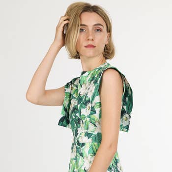 There's no better pick than the Davina Floral Ebba Shift Mini Dress. A green print with white background creates this short ruffle sleeve and split neckline. Twirl around to show off the shift style. Pair with white heels to go along. - Shift - Split neck - Floral - Mini - Color: White Greens Size + Fit - Model is 5'10" and wearing size XS - Measurements taken from size S - Chest: 19 1/2" - Length: 35"