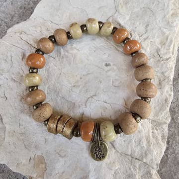 Raw clay sourced in the central plateau region in Haiti is processed + individually hand rolled by talented artisans in Port-au-Prince, Haiti - transformed into beautiful ceramic jewelry. * Handmade in Haiti * Glazed, kiln fired clay beads on elastic * Approximately 7” diameter * Antique brass spacer beads * Inspirational antique brass hand-stamped charm {25mm circle OR 12mm hexagon} Single bracelet listing || some photos shown in stacks