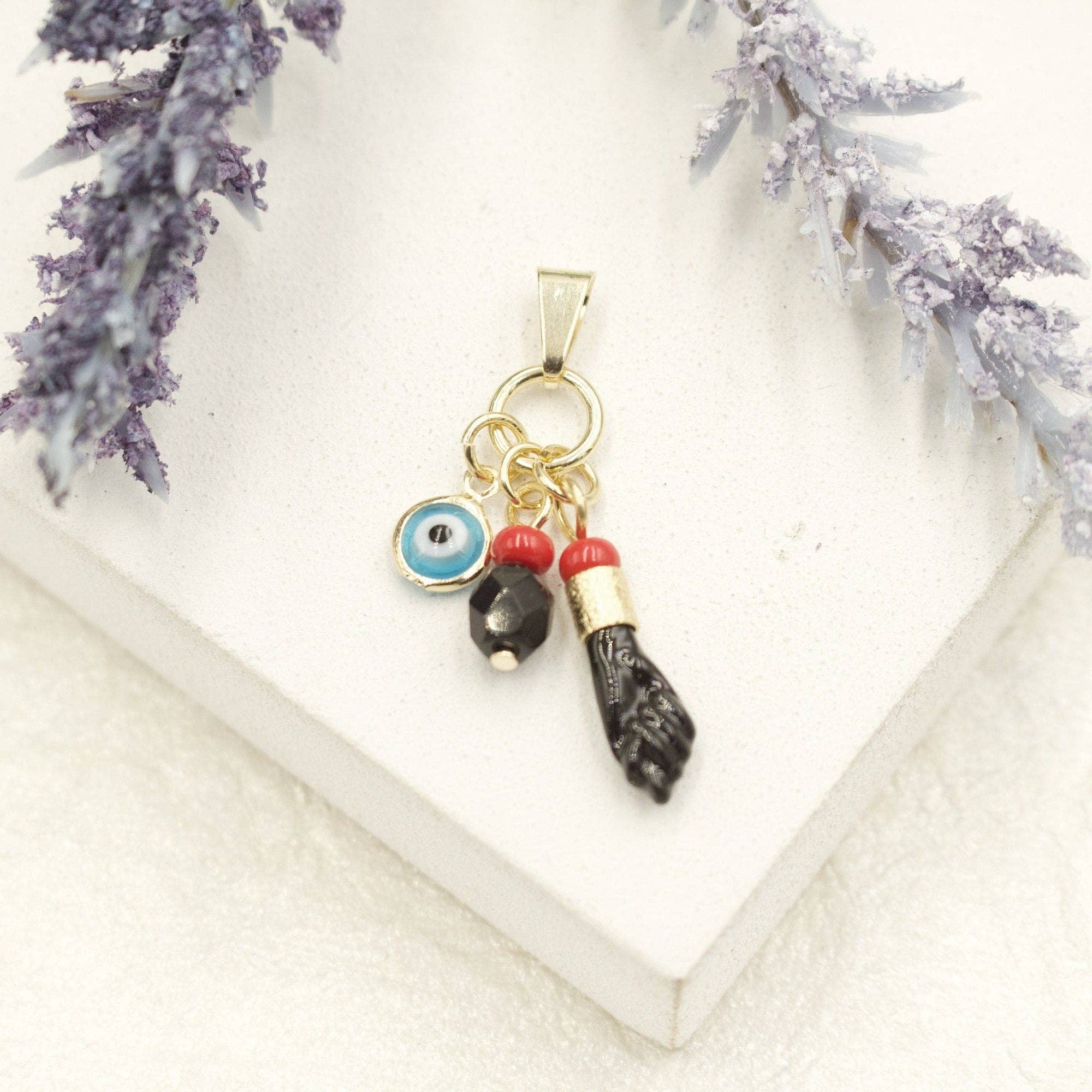 18k Gold Filled or Silver Filled, New Born Simulated Azabache, Figa Hand, Evil Eye Charms Pendant