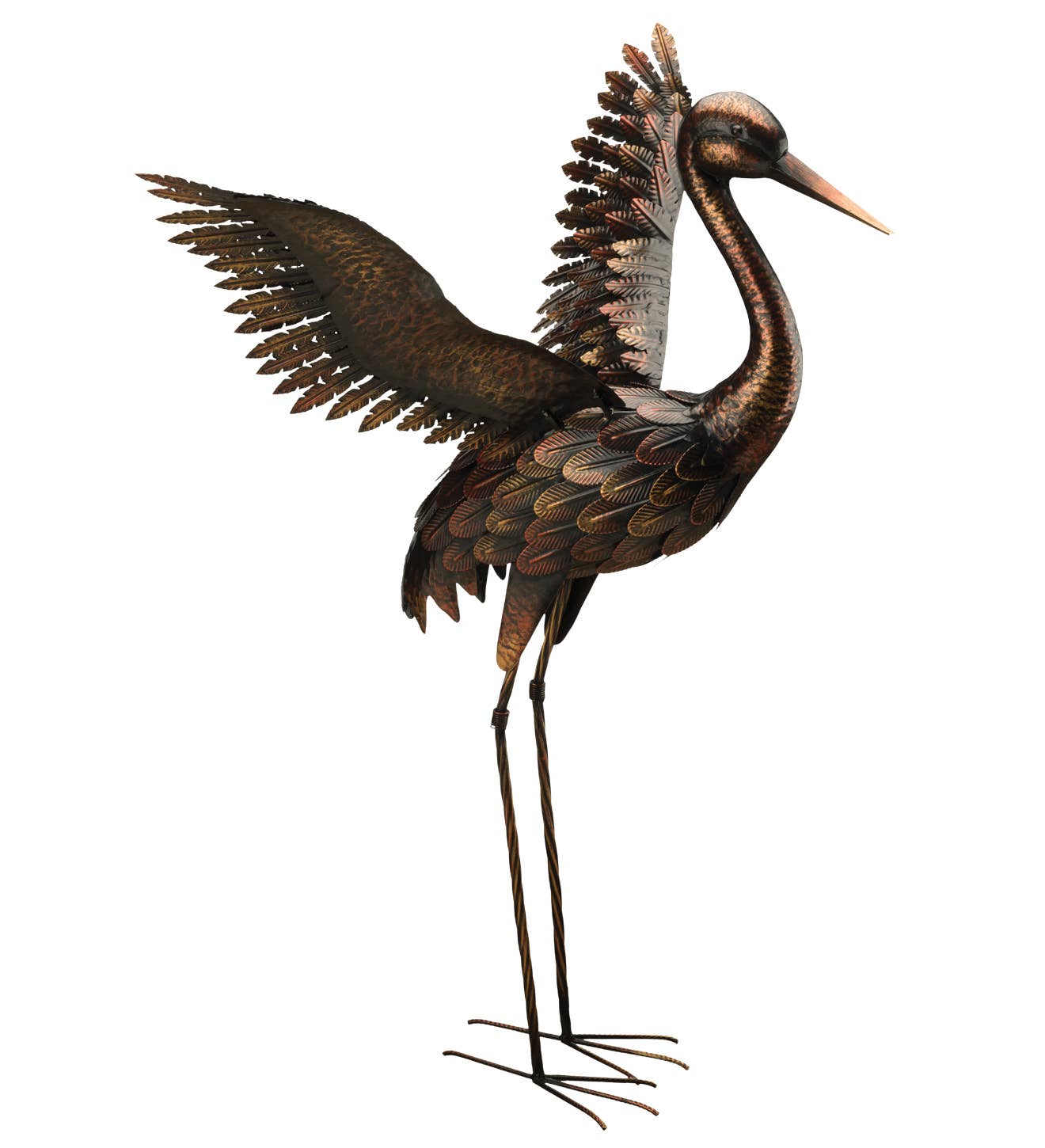This impressive 41" tall Bronze Crane Statue has spread wings and makes a grand statement in any yard. Hand-painted in an attractive bronze metallic finish. The wings have incredible detail with all individual feathers and lots of embossed details. Pairs nicely with the 'Wings Up' version (SKU 11517).