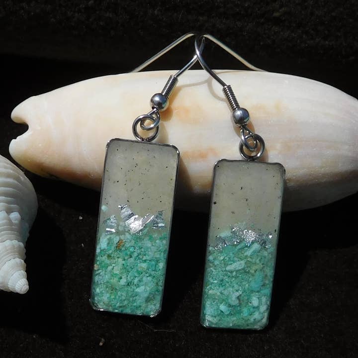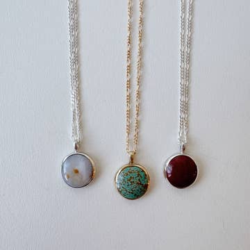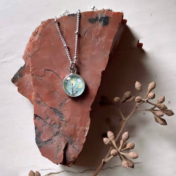 The perfect necklace to remember a trip to the Beach. This necklace is handmade using sand from YOUR local beach OR use our sand. Each pendant contains a small amount of sand from your beach (mailed to me), crystals that represent the color of the water and a little shimmer of silver leaf. I hand make each pendent using resin to create a custom scene just for your store. Pendants are similar but each one has unique features. 1) Just mail your sample sand to me (about 6 oz.) or you can use the Sugar White Sand I have from the Florida Panhandle. Your sand will appear wet when in the resin, so the color will be darker from dry sand. 2) Choose the crystals type: Chrysocola (Light turquoise), Lapis Lazuli (dark blue) , or Abalone (beige) Each pendant is Silver plated and comes with a matching 18" necklace chain. Pendant measures approx. 1/2 " across.