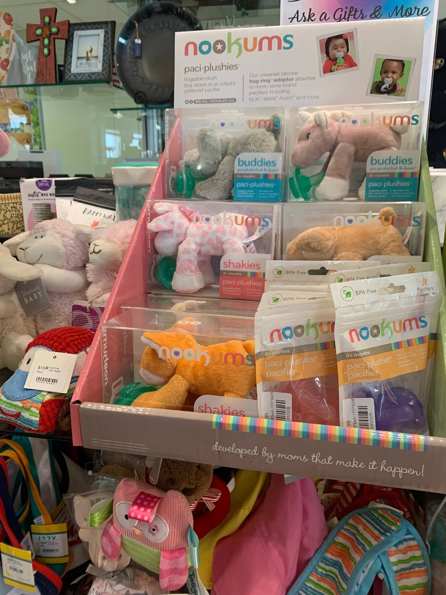 Paci-Plushies® Counter Display filled with our Top Selling Paci-Plushies®: Kit Animals Assorted Top Sellers (24 pcs total) Rufus Retreiver - 6 pcs Leo Lion - 3 pcs Georgie Giraffe - 3 pcs Barkley Bulldog - 3 pcs Lexie Lobster - 3 pcs Freckles Fox - 3 pcs Starflower Unicorn - 3 pcs (24 units total) Counter Display - 1 pcs Note: Display and Product may arrive on different days through mail Nookums® Paci-Plushies® Eliminate the stress of searching for lost pacifiers. Easily Replace Pacifiers - Each Nookums® Paci-Plushie® includes our 100% silicone Nookums® Pacifier that detaches from the animal for easy replacement & sanitation. Use our Nookums® Pacifier or swap it out for your own. Paci-Plushie® Pacifier Holders have a flexible Hug Ring® that attaches to a variety of baby's favorite pacifiers including Mam, Avent, NUK and many more. Paci-Plushies® are compatible with most Brand Name pacifiers with Button, Ring, Knob and Soothie® tab handles.