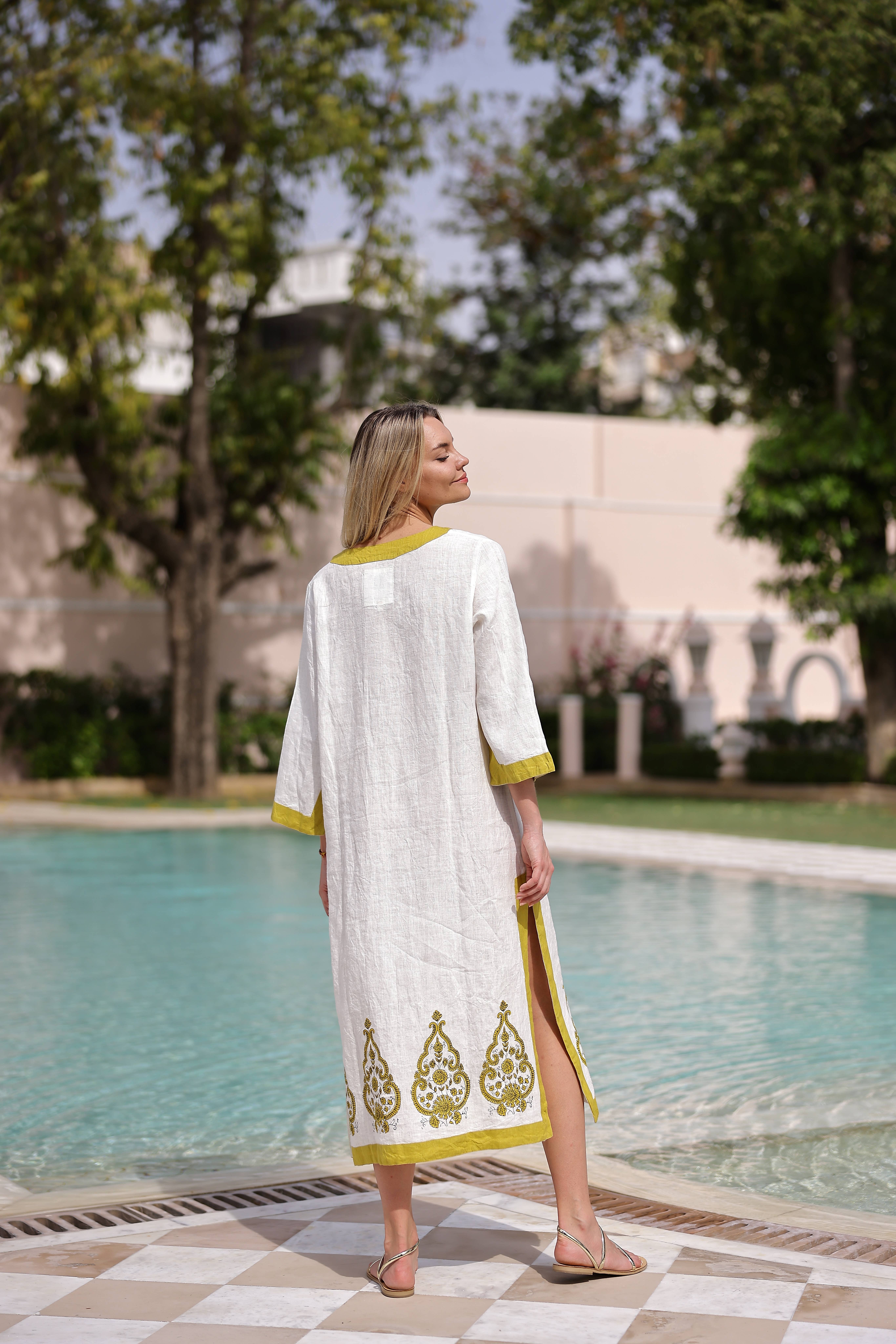 Stay trendy and comfortable with the Evil Eye Kaftan Kimono Made from 100% organic cotton and hand-printed with the timeless evil eye design, this Greek goddess-style kaftan is the perfect cover-up for all your summer needs. Whether you're spending the day at the beach, picnicking in the park, or just lounging at home, The lightweight, breathable fabric will keep you cool and comfortable, and protected from evil spirits and evil eyes. This eco-friendly and quick-drying kimono is an excellent choice for summer activities. Features 100% Cotton Soft, Light & Fluffy An adjustable waist belt secures the robe from the front. Sizes Length: 46.062" inches - 117cm Width: 33" inches - 85cm Care Machine wash cold at a gentle cycle. No bleach. Iron on the reverse side