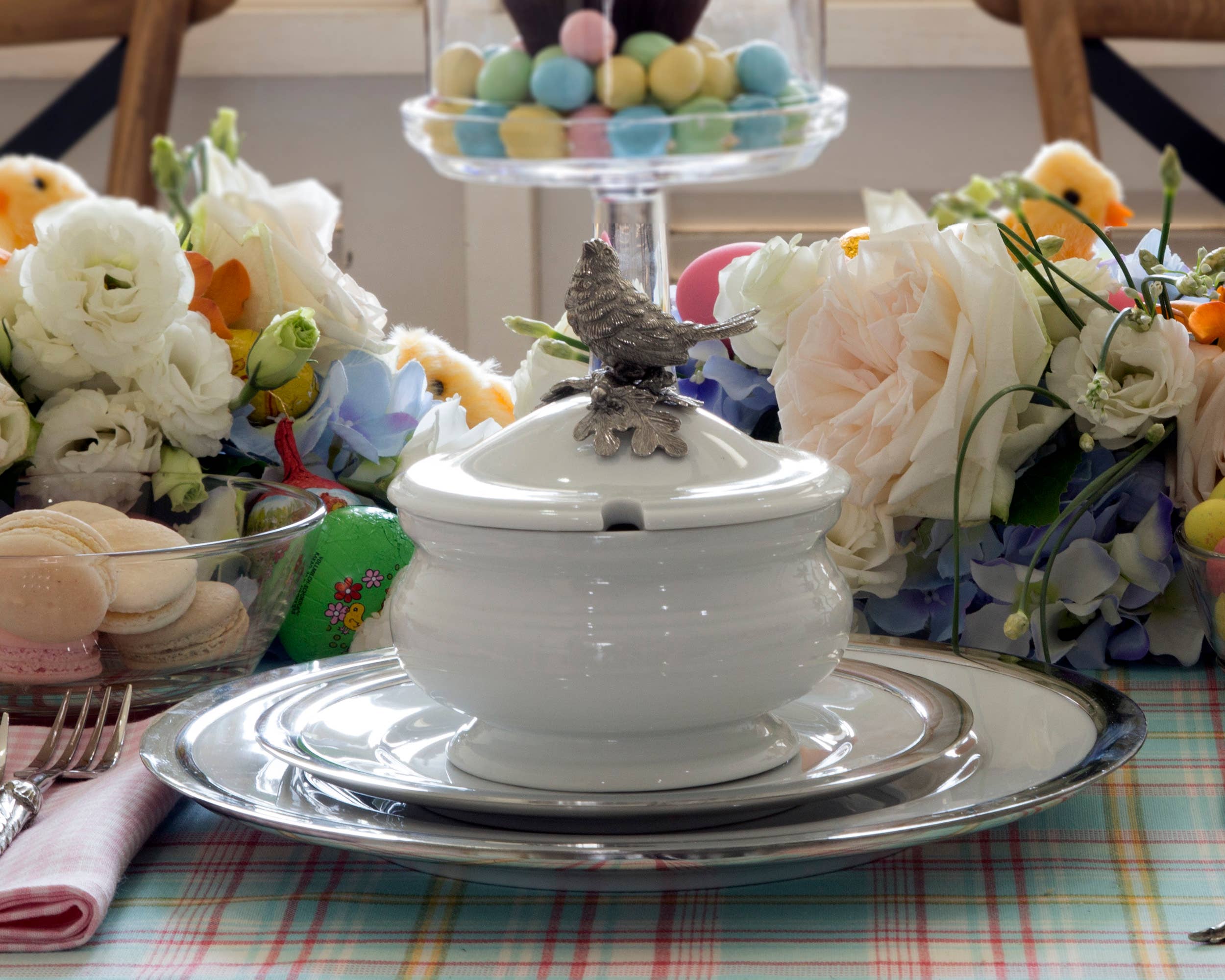 Choose something saucy for your autumn table décor. Our Acorn & Oak Leaf Dip bowl is perfect for dips and sauces of all kinds. We also like to serve candies and nuts in this clear glass dish embellished with a ring of acorns and oak leaves at the base. The detailed pewter flora act as 'feet' for the dish. Size: 5" W x 3.25" H Care: Hand wash with warm water and a soft cloth.
