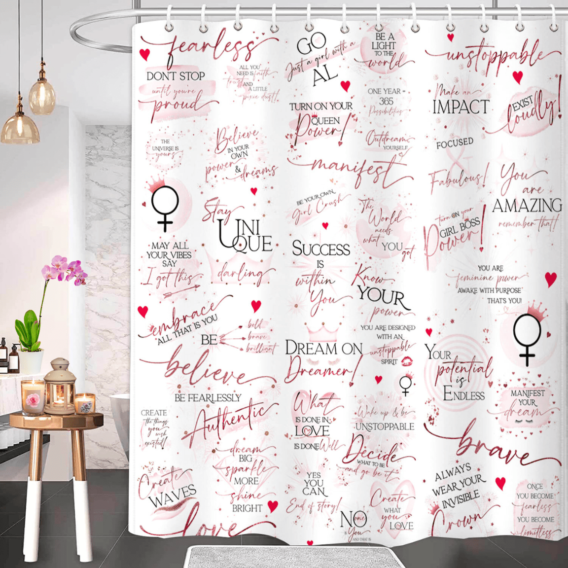 Create a Statement Wall That Speaks Confidence. Adorned with 50+ empowering quotes and affirmations in fun, feminine, and elegant fonts—sprinkled with hearts to remind her to follow hers—this peel & stick wallpaper transforms any space into a canvas of bold self-belief. From dressing rooms to dorms, office nooks to boutique corners, it’s designed to spark daily confidence and connection at a glance. Perfect for mirror pep talks, vision boards, or motivational DIY makeovers, each roll brings joy, purpose, and inspiration to her everyday routine. A standout gift for Women’s Day, birthdays, graduations, or young ladies designing their own canvas of confidence. A visual centerpiece for boutique displays that celebrate female empowerment. Pairs with the Girl Power 24/7 Collection—shower curtains, journals, pens & totes. Details: • 1 roll = 18 in x 16.5 ft (24.75 sq ft) • Unique 8 ft non-repeating quote design • Premium peel & stick vinyl • Removable & repositionable • Made in the USA