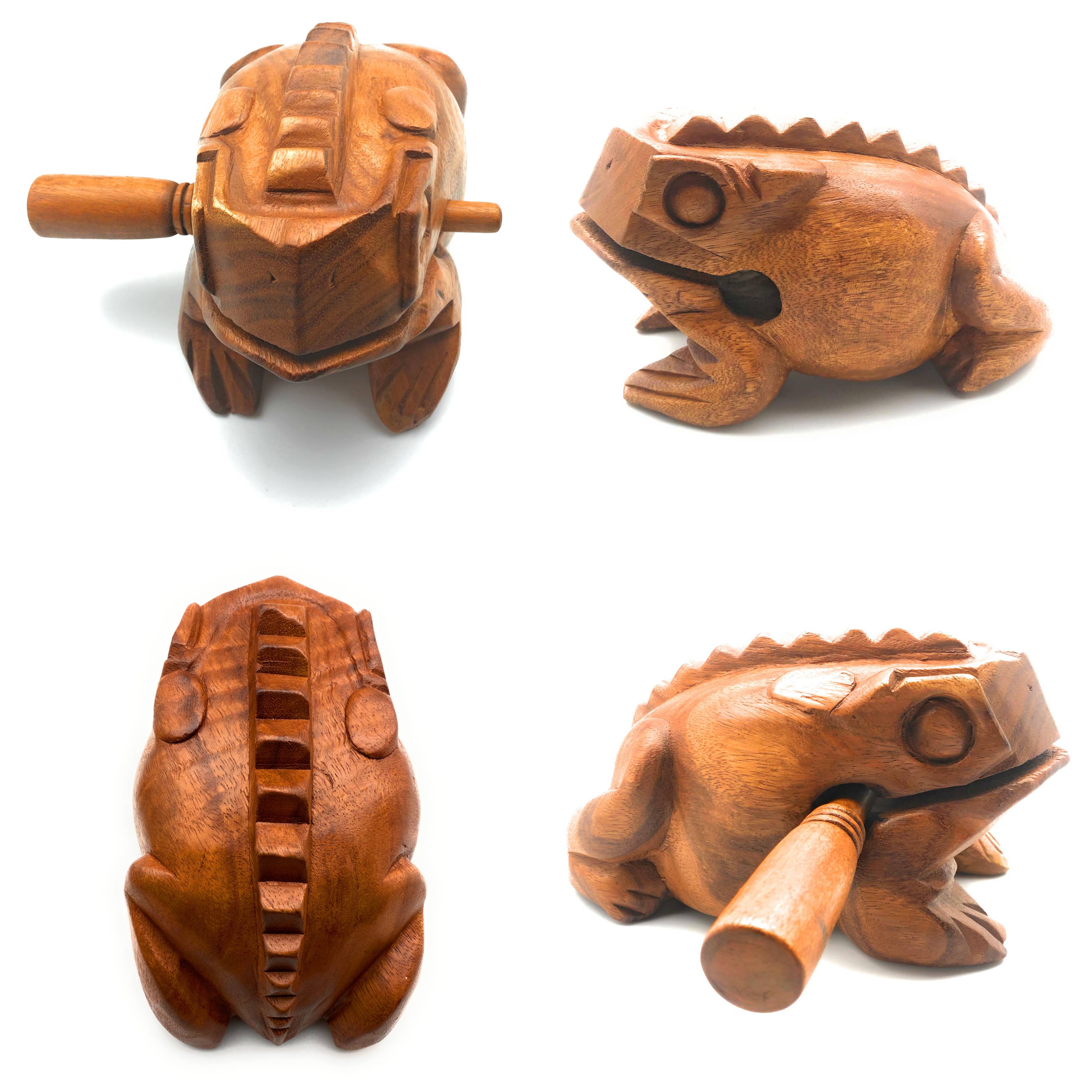 Jumbo green waxed 8 inch croaking singing musical frog drum rasp. A great musical instrument percussion toy from wood that makes a deep “ribbbit” sound when you rub the included striker up its back. (Available in many sizes and colors).