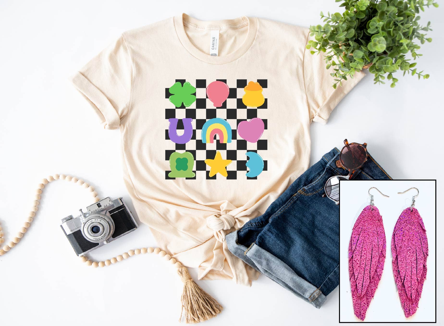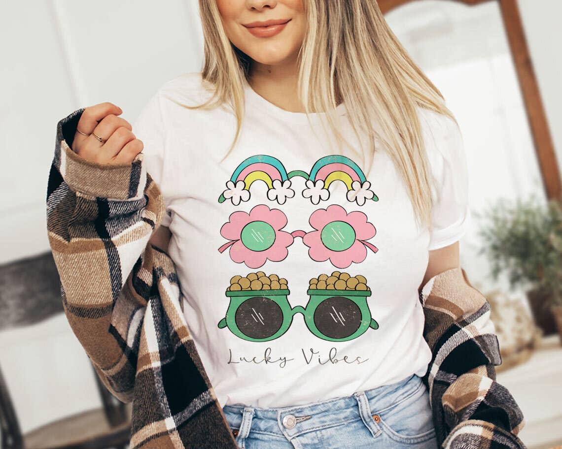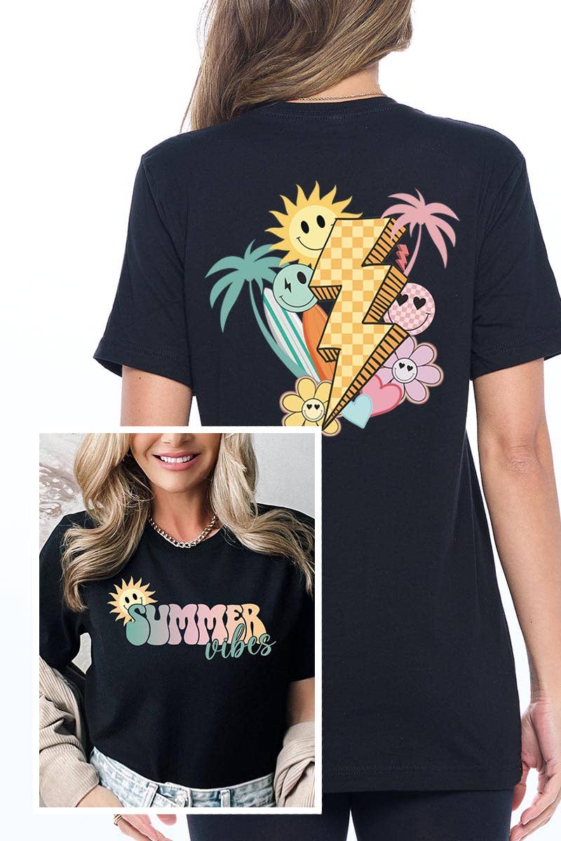 Retro Fruity Summer Mineral Washed Cool Mint Graphic Shirt * 100% cotton, mineral washed mint green graphic t-shirt. * This graphic t-shirt's design features a big yellow and white checkered lightning bolt, surrounded by fun objects like smileys, fruits, a popsicle, a flower, a disco ball, and more. This top is perfect for summertime! * Application: The graphic of this top is applied using a direct-to-film (DTF) printing method, which is then transferred to the garment. * Sizing Hint: This is a basic unisex tee, which fits true to size. See additional images for sizing charts. * Care Instructions: Machine wash cold. Do not bleach. Tumble dry medium. Do not dry clean. This jumble of fun and energizing shapes will get you charged and ready for the summer!