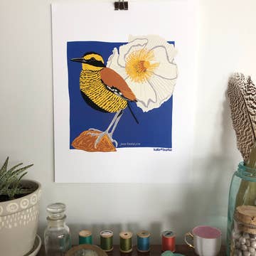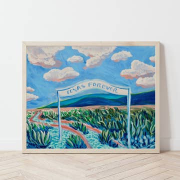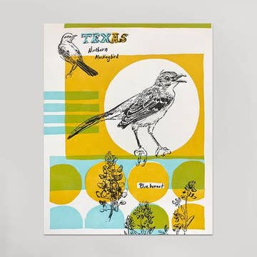 Show big love for the Lone Star State with this print by illustrator Laura Marr (who grew up in Texas). Laura's signature undulating ink lines show the beautiful Texas springtime; the state bird, the Mockingbird, sits atop a flowering Pecan tree, the state tree. Hand-drawn and lettered in ink, "Texas" is proudly emblazoned across the central banner, and is flanked by a bouquet of Bluebonnets, the state flower. A Prickly Pear cactus and sly little scorpion peek out from below. NOTE: prints are packaged individually in cello sleeves, frame not included. IN STOCK and AVAILABLE FOR QUICK SHIPPING, 5-7 DAYS Printed in the USA on heavy, 110# Mohawk Via Felt Bright White Cover. Paper is certified by the Rainforest Alliance Program for FSC Standards/30% post-consumer recycled content.