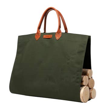 Our durable, handmade log carrier is the perfect accessory for your fire pit. Confidently move logs from point A to point B with easy-grip leather handles and a tough canvas body. We guess you could say, this product is fire! Dimensions: 35"L x 22.5"W Available in Olive Canvas, Black Canvas, and Waxed Briquette Canvas Full grain U.S. cattle hide brown leather bottom & hand grips Not only is this product made in America but it's also made to order.