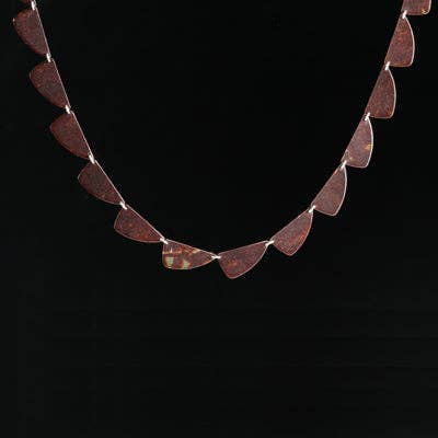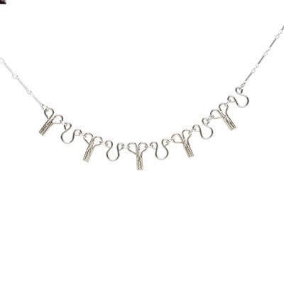 Two sets of three guitar picks link together and hang from a sterling silver chain. 40" total length.