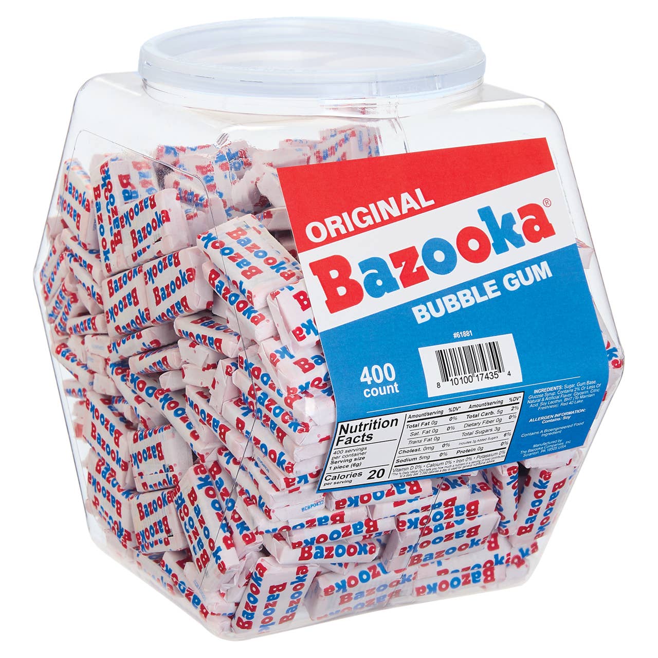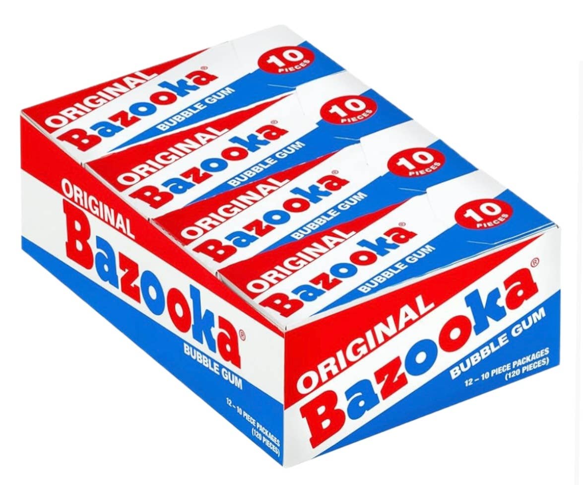 Customers have enjoyed the soft chew and authentic bubble gum flavor of Bazooka gum for generations. With new updated brightly colored packaging, there's even more to love. Each piece of Bazooka bubble gum comes individually wrapped and presented in a large acetate tub.