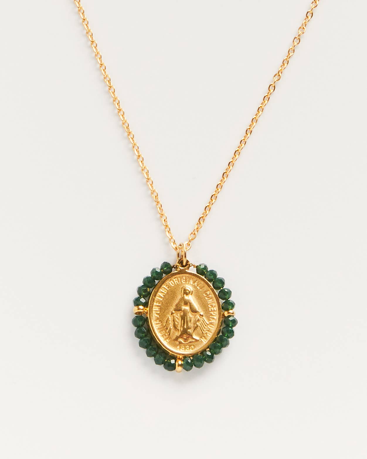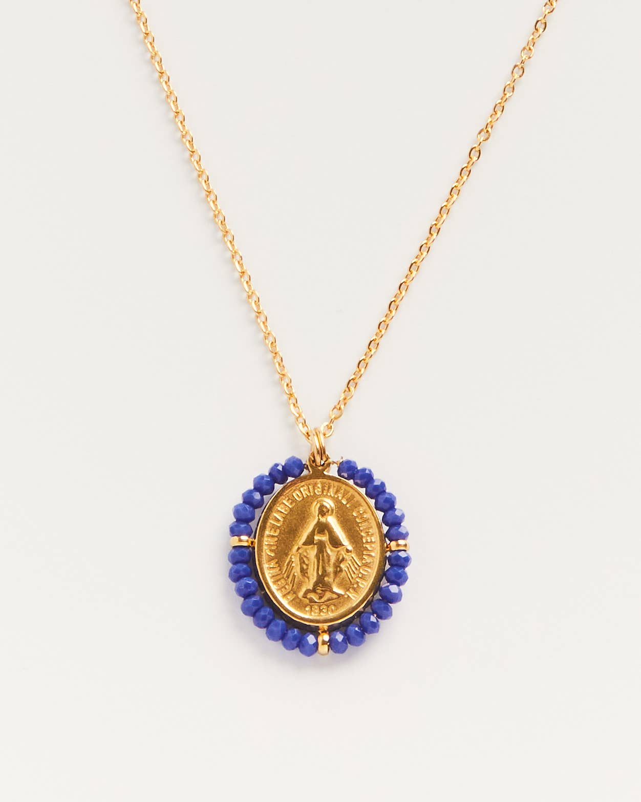 Silver santa Maria pendant with a delicate golden stainless steel chain, clasp with small pastille. Daniela, the model, is wearing the misty rose santa necklace. Length of the chain 44 cm / 17 inch This jewellery was handcrafted in PALAS Lisboa workshop.