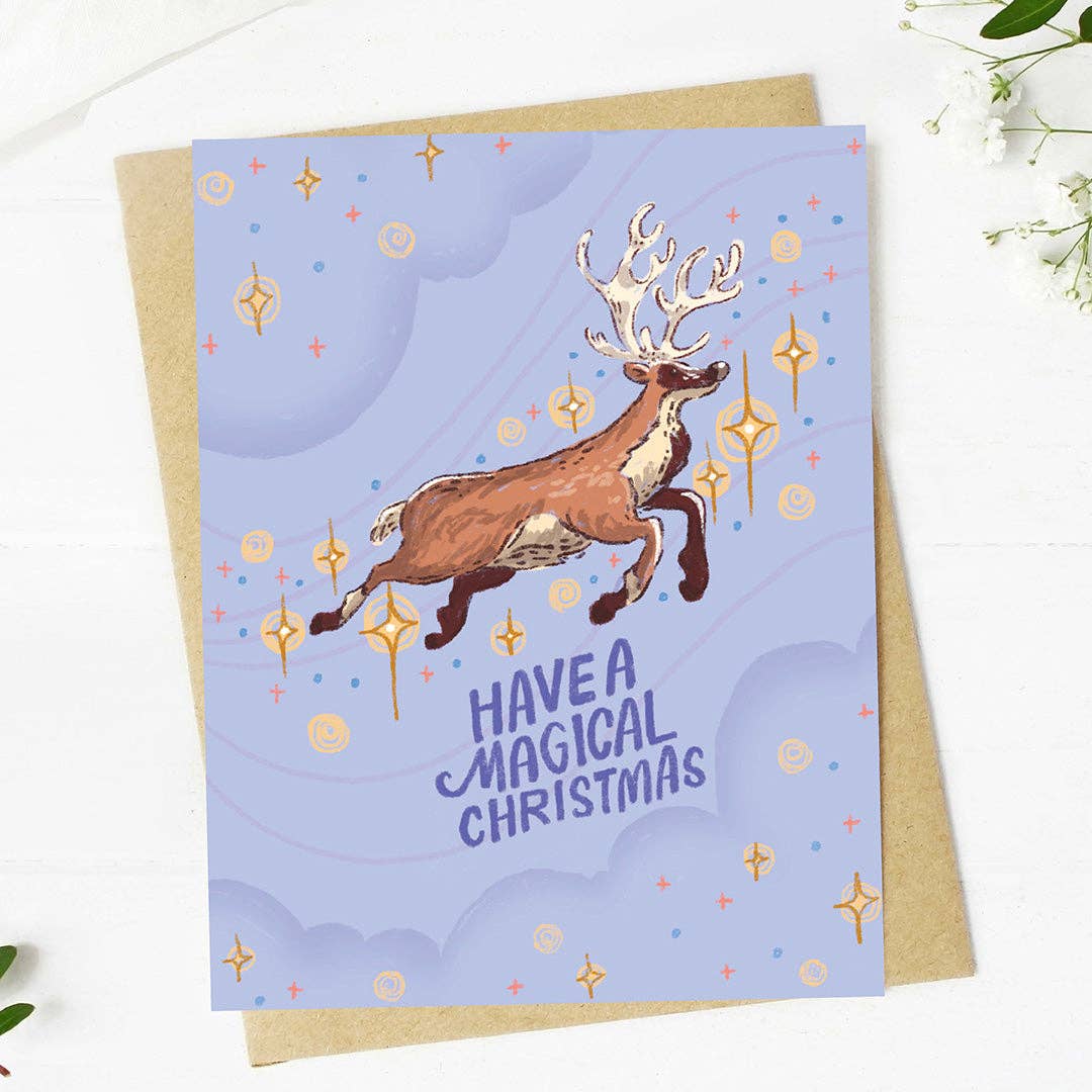 Oh deer! Add a little magic and spread some glee with our card featuring Rudolph and friends. Holiday Card, A2 Size - 4.25 x 5.5 inches with foil embellishments. Comes with a coordinated envelope and packaged in a clear sleeve. Blank inside. Lovingly designed by Carolyn Suzuki in Los Angeles, California. Printed on carbon neutral FSC certified paper in the United Kingdom