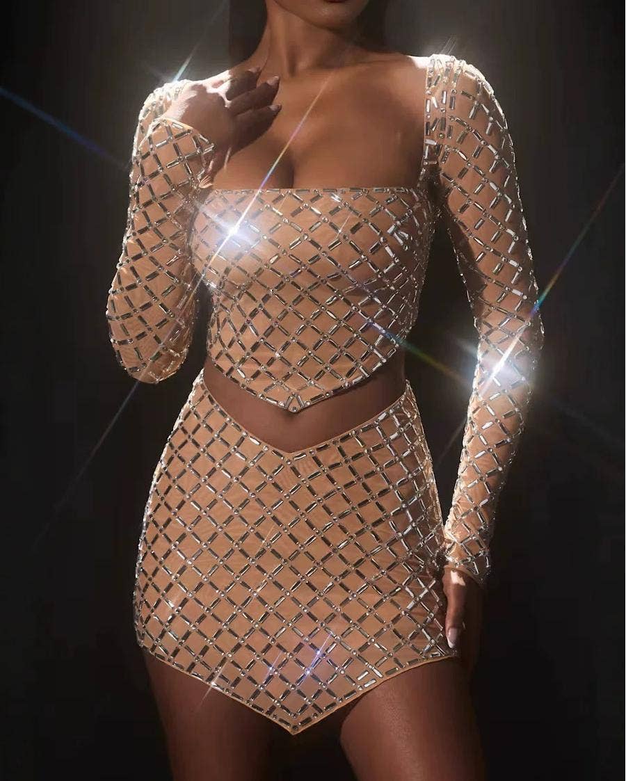 sequins slit long sleeve top pants set