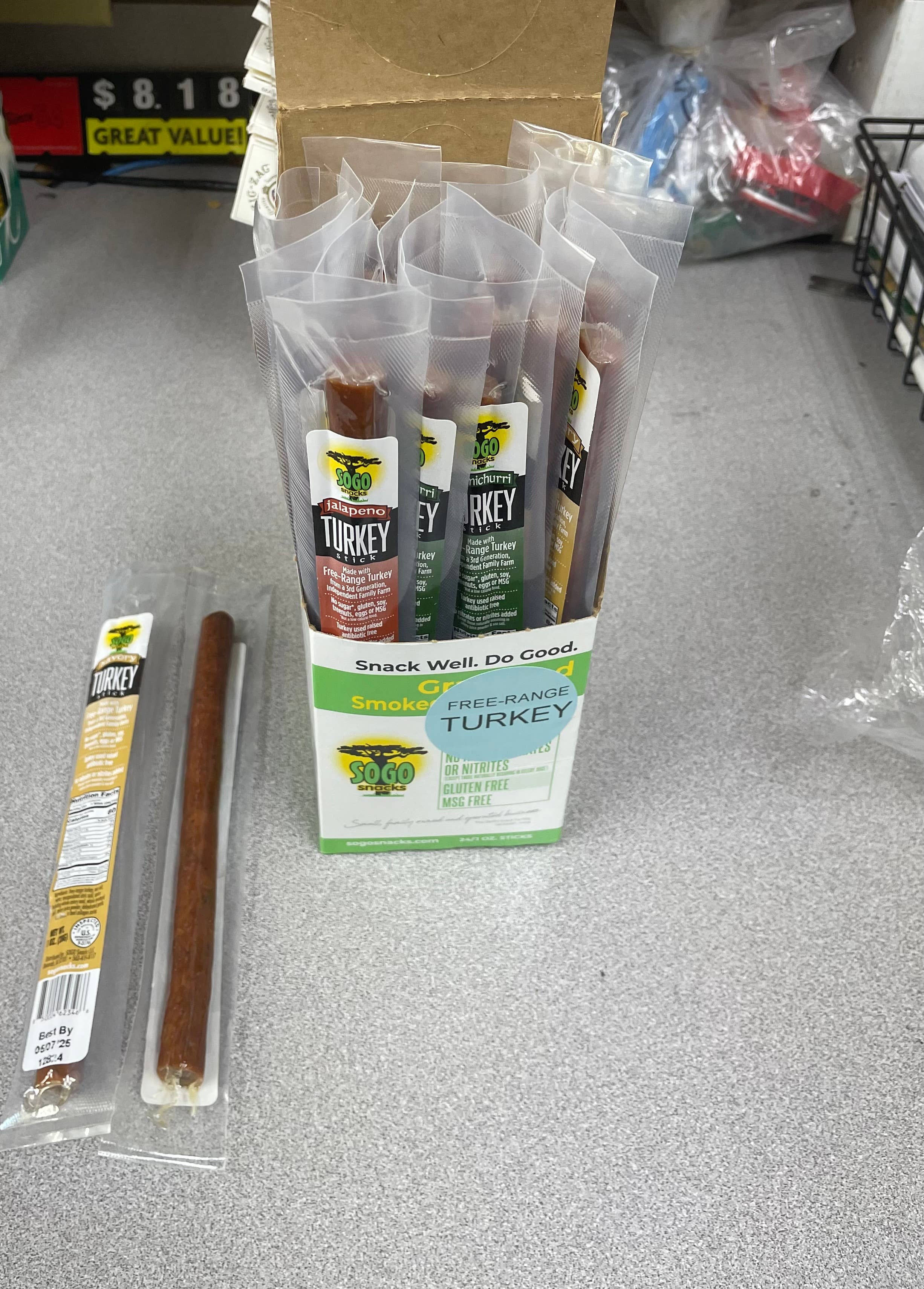 Our Turkey variety pack consists of equal amounts of each of our three turkey sticks. With no added sugar and 7g of protein, our Savory, Chimichurri and Jalapeño free-range smoked turkey sticks are made with responsibly-sourced, good-for-you meat: * Made with 100% Free-Range turkey * Raised on a 3rd Generation, Independent Family Farm * Never given hormones or antibiotics—ever All Sogo Snacks come with our clean food guarantee: * No gluten, soy, dairy, nuts, eggs, or MSG * No nitrites or nitrates added, except those naturally occurring in celery juice and sea salt * Minimally processed & no artificial ingredients * Product of USA