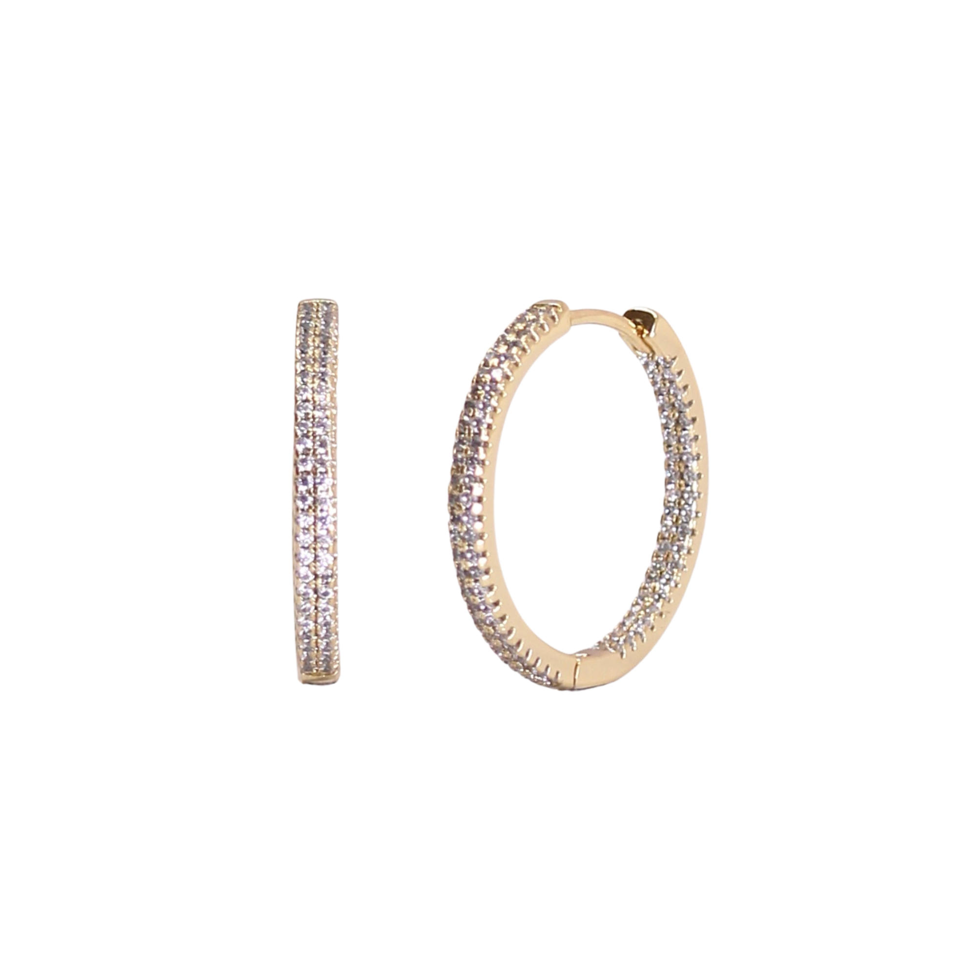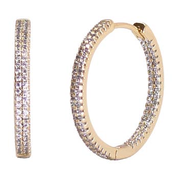 PRODUCT DETAILS * Waterproof💧💧💧 * Stainless Steel and Cubic Zirconia Crystals * 18K Gold * Hypoallergenic * Nickel Free * SIZE: 18mm Diameter Designer Note: Classic with a twist. These 18mm diamond hoops are the ultimate in versatile sparkle. Dress them up or down, they’re perfect for any occasion and made from waterproof 18K gold over stainless steel, featuring stones that shine like real diamonds.