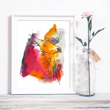 Embark on a journey celebrating the awe-inspiring power of the sun with our captivating illustrated art print, "Poderosa." This vibrant and colorful print showcases an illuminating sun radiating its energy over a picturesque field of cempasúchil (marigold) flowers, set against a backdrop of clear blue skies and fluffy white clouds. This print, derived from an original illustration, invites you to embrace the inherent beauty and strength of nature. Measuring 5" x 7" and printed on high-quality Palo Duro Etching #315 paper, this print comes stored in an archival sleeve, awaiting your personalized framing. Illuminate your space and embrace the divinity of nature with this empowering artwork. Frame not included. Artwork and photography © 2023 Kandy Caballero for ArtKandy