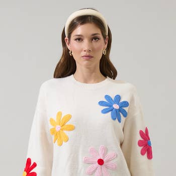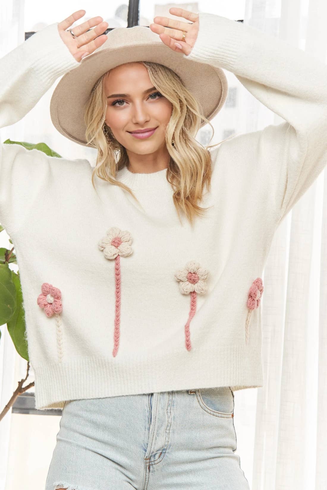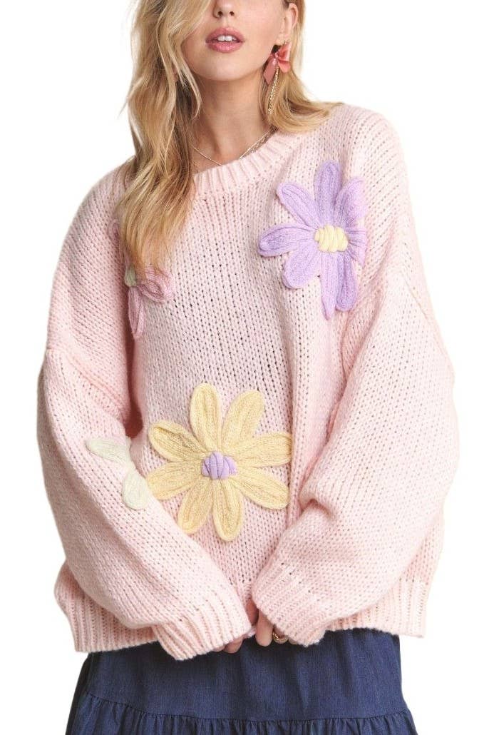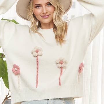 Drop Shoulder Sweater Knit Top With 3D Crochet Flower Sleeve Detail