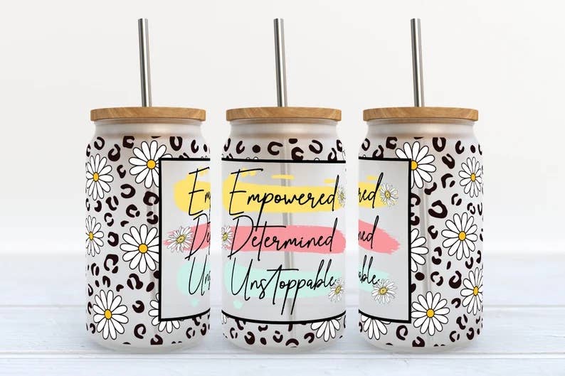 This glass can is perfect for iced coffee, tea, lattes, sparkling water, or your favorite cold drink. ★Product Specifications★ • The design is sublimated on so it won’t crack, peel or wash away! • Stylish, reusable, and sustainable. • Bamboo push on lid + Straw • 16oz ★Please Note★ Handwashing is recommended to preserve the longevity of the ink. Only place in top rack of dishwasher on low heat cycle. ★Custom Designs★ If you would like to see this design on a different product or would like changes made to the design please send us a message and we will try to accommodate! Some custom orders may require an additional artwork fee. ★Questions?★ Drop us a note we love to chat