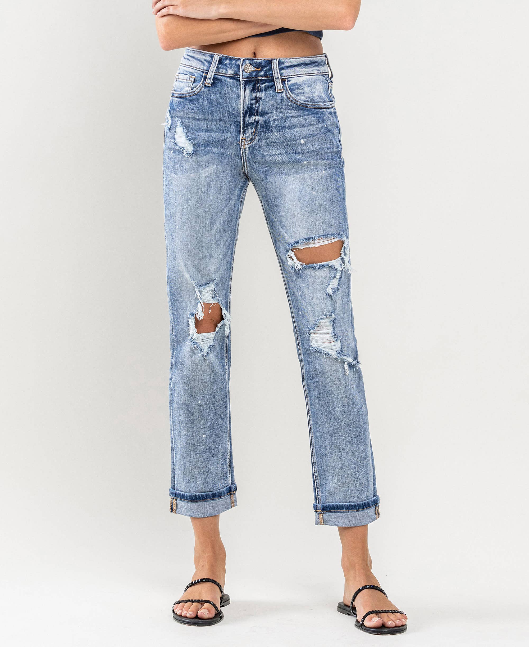 MID RISE DISTRESSED PAINT SPLATTER SKINNY JEANS COMFORT STRETCH DENIM, MID RISE WAIST, PAINT SPLATTER DETAIL, DISTRESSED DETAIL, CROPPED LENGTH, SKINNNY JEANS F. RISE: 9" / INSEAM: 27" / LEG OPENING: 9 3/4" MODEL IS 5'9" WEARING A SIZE 26