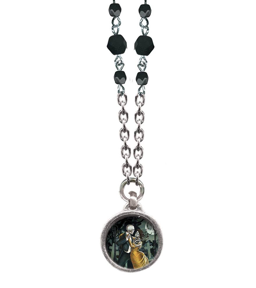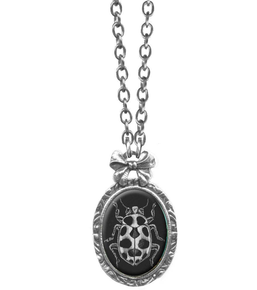 Float like a butterfly, sting like a wasp! This antiqued pewter pendant resembles a wasp perched in a gothic picture frame, hanging like a plaque on the walls of a haunted mansion. To complete the vintage look, the silver plated chain is dotted with small glass beads, available in an assortment of spooky colors to match any outfit. This unique creepy-crawlie necklace is sure to be a conversation piece, whether you love bugs, gothic style, or just weird and wonderful jewelry, like us! Handcrafted right here in our studio in Los Angeles! Features: •Antiqued Pewter Pendant with Glass Beads on Silver Plated Chain •Necklace Measures Approx. 17" •Wasp Plaque Pendant measures approx 1.50" H x 1"W •Hypoallergenic •High Quality Construction