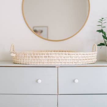 Our cotton rope diaper caddy is designed to store newborn essentials. Its size of 15” x 9.5” x 7” makes it not too bulky while large enough to keep everything you need. It has three spacious padded and flexible compartments, making it easier to find wipes, creams etc. Our diaper caddy is designed with a neutral beige color, pinstriped beige & off white inner lining and two white hanging pompoms. The multi purpose soft woven baby tote bag is made of rope exterior. It is strong and durable. It can be spot cleaned or washed in gentle cycle with mild detergent and air dried. It comes folded so it will have to be reshaped.