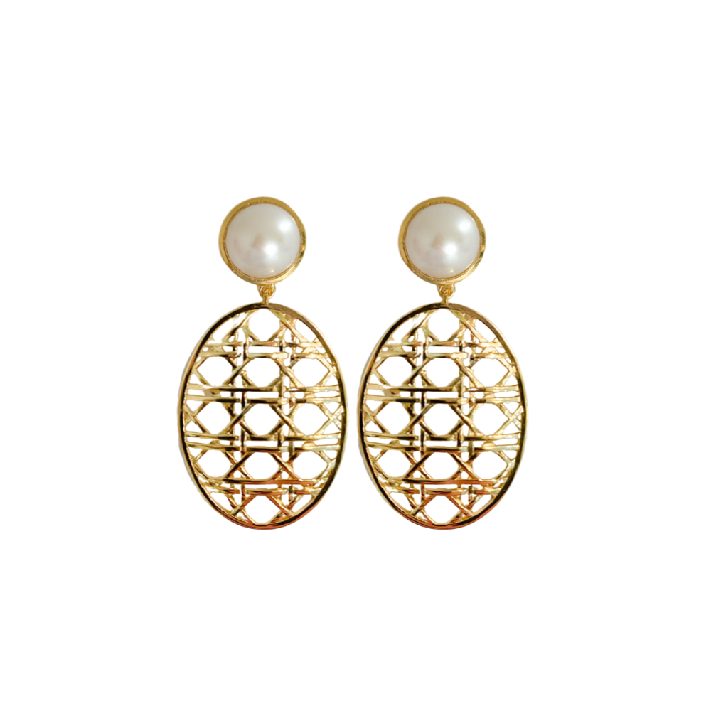 These elegant earrings feature a trio of gold pieces with an intricate basket weave design. The combination of round and square shapes adds dimension and sophistication, perfect for elevating any outfit. 18k gold-plated brass Nickel free Approximately 2"