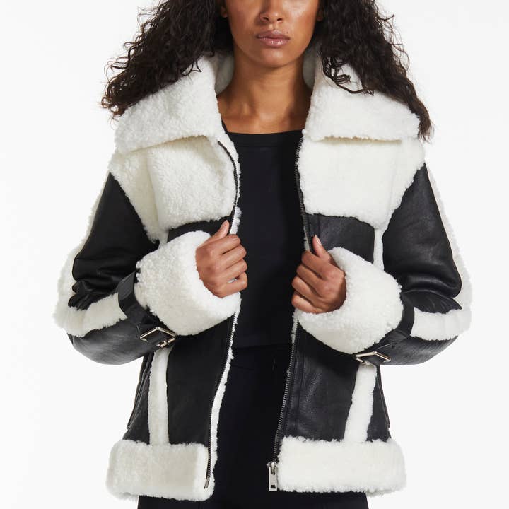 A heavy-duty bomber jacket crafted from organic soft wool in a dramatized ottoman stitch with calf leather detailing along its sides and sleeves. A geometric and defined silhouette with broad shoulders and a cinched waist. Two pockets, high collar, ribbed cuffs, as well as substantial lining for premium insolation. Frontal snap-button closure at center front. Dry-clean only 100% Wool