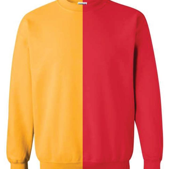 Get the best of both worlds with our Red & Black Split Colored, Two-Toned, Crewneck Sweatshirt! Stay cozy and trendy at the same time with this playful and stylish sweatshirt. Perfect for those who love to stand out and make a statement. Please note: these crewnecks are hand cut and sewn, no two will look the same. This is a physical product. This product is unisex. This product is BLANK. Choice of color side is NOT available; crewneck colors will be on either the left or right. This is a wholesale, cut-and-sew garment intended for resale or private labeling. Garments are not sold as retail-ready. Final consumer-facing labeling is the responsibility of the retailer prior to resale. Garment Details: 8 oz./yd² (US), 13.3 oz./L yd (CA) 50/50 cotton/polyester, 20 singles Heather Dark Green, Heather Dark Maroon, Heather Dark Navy, Heather Deep Royal, and Heather Scarlet Red are 60/40 polyester/cotton Safety Green is compliant with ANSI / ISEA 107 high-visibility standards Classic fit 1x1 rib with spandex for enhanced stretch and recovery Handmade in the United States