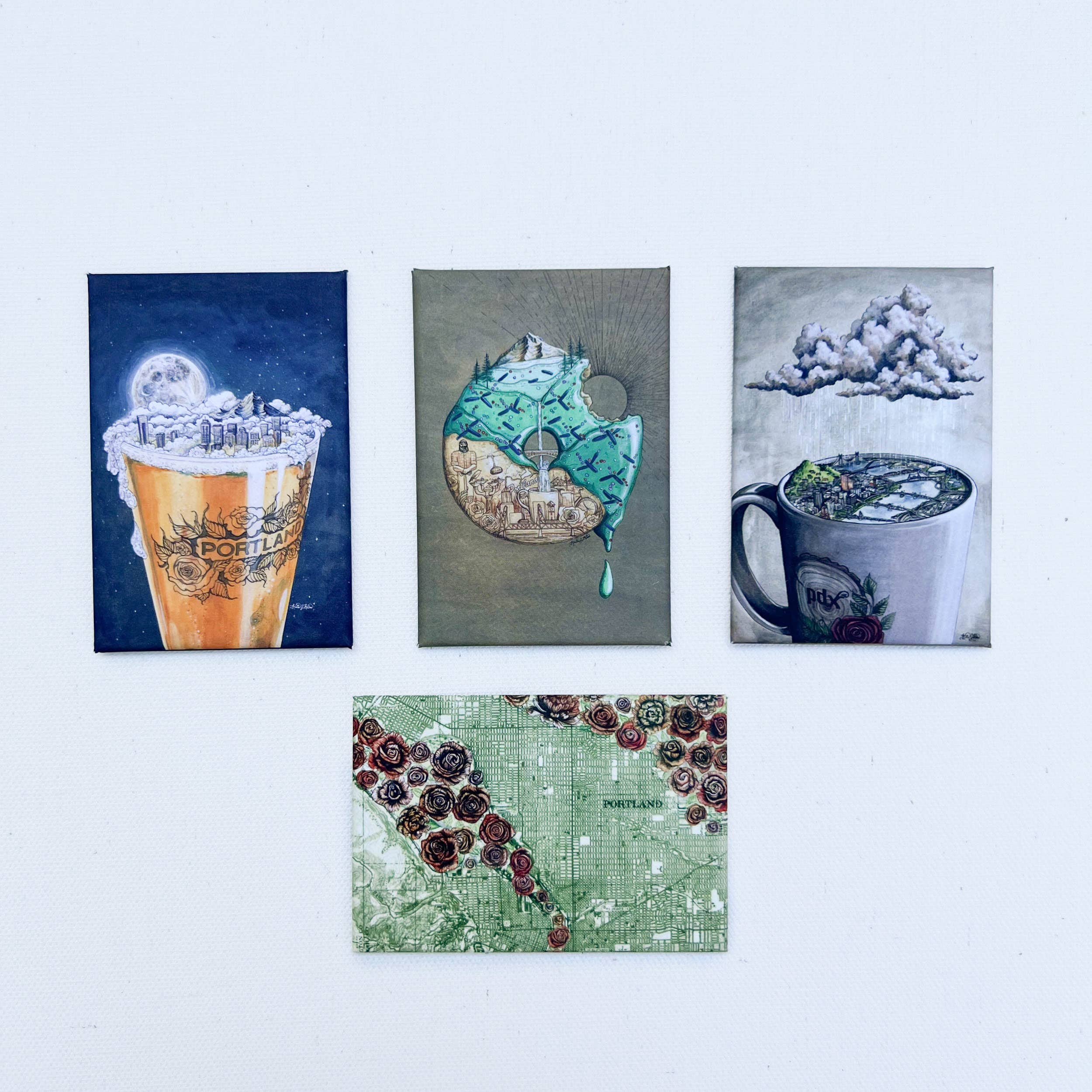 My original paintings of some of Oregon's favorite wild places and mountain views are featured on these crisply printed rectangular fridge magnets. Mt Hood, Smith Rock, and Tillamook Forest. Great for the adventurer and travelers to the PNW. -2x3" durable, high quality, matte finish button magnets -Packs of 10 per design -Other images available with a minimum first order of 50
