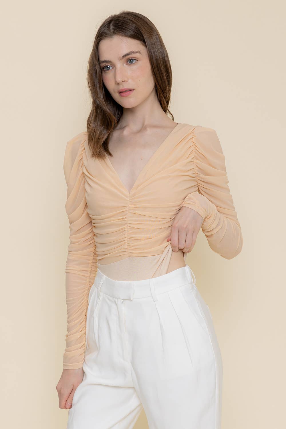 Wholesale Solid Straight Neck Pleated Flounce Bodysuit