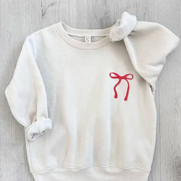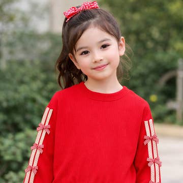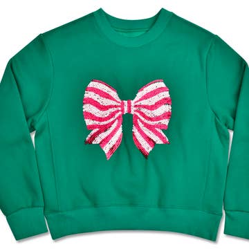 tween girl fleece sweatshirt adorned with tinsel bow applique all over it. Pre-Pack Of 6 S, M, L, XL (1, 2, 2, 1) Small = 7/8 Med = 10 Large = 12 XLarge = 14