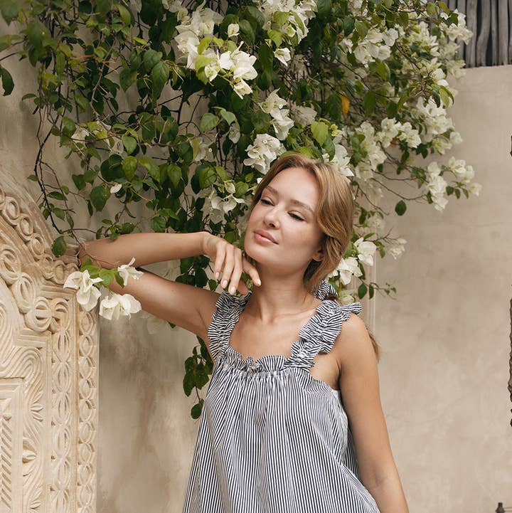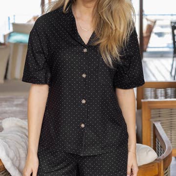 FREE SHIPPING* Navy Step into serene evenings with the Stella pyjama short set, featuring a timeless pinstripe pattern. Adorned with contrasting trims and crafted from premium soft cotton. It’s a perfect blend of style and cosiness, making a bedtime into a luxurious affair. · Short sleeved top · Button down opening · Top pocket detail · Relaxed fit · Matching shorts with side pockets · Designed in Australia · Made ethically · Sustainable material Size Guide: 8 fits size XS-S 10 fits size M 12 fits size L 14 fits size XL Our model wear size S/ AU8/ UK8/ US4/ EU36 Minimum order is 3 pcs per pack. Size breakdown S/M/L=1/1/1 Care Instructions: Cold gentle machine wash with like colours