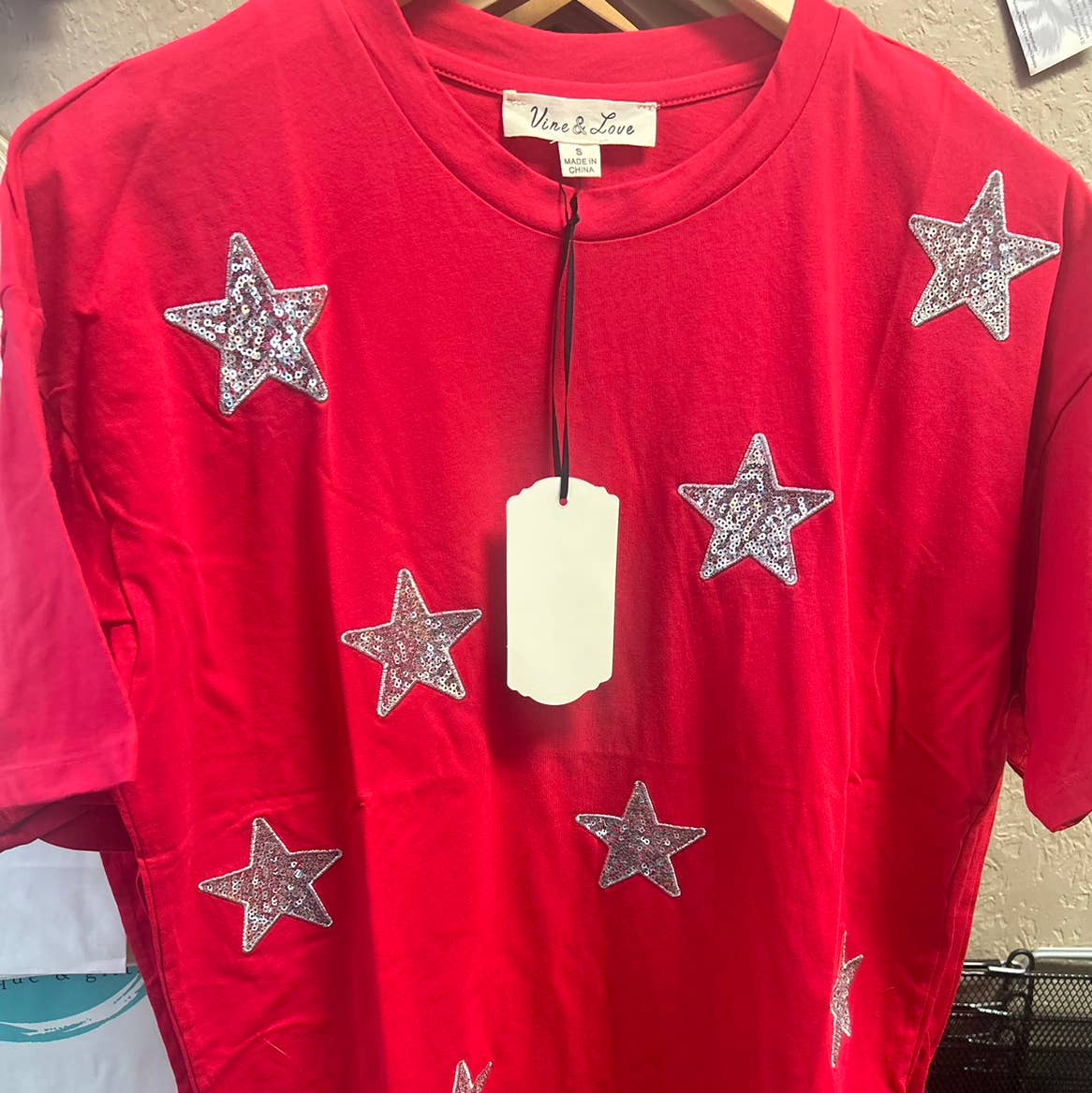 SKU: VT81617-Black-S, VT81617-Black-M, VT81617-Black-L Made in China Aesthetic: Casual and Preppy Care Instructions: Hand wash Embellishment: Sequined Fabric: 100%Cotton Fit: Contemporary and Missy Neckline: Crew neck Occasion Theme: Fourth of July, Holi, and Memorial Day Occasion: Day Party and Holiday Pattern: Stars Season: Core Sleeve Length: Short Sleeve Product Language: English Weight: 226.8 g (8 oz)